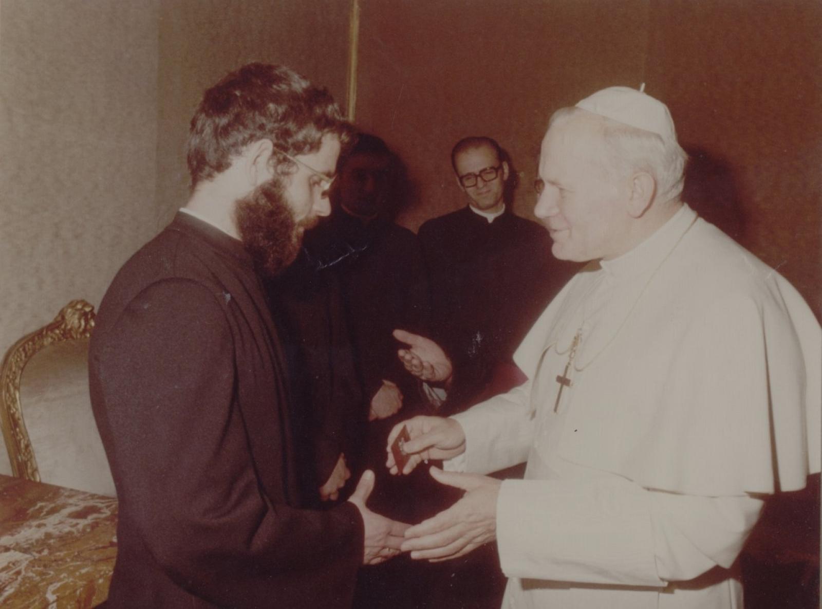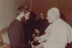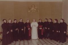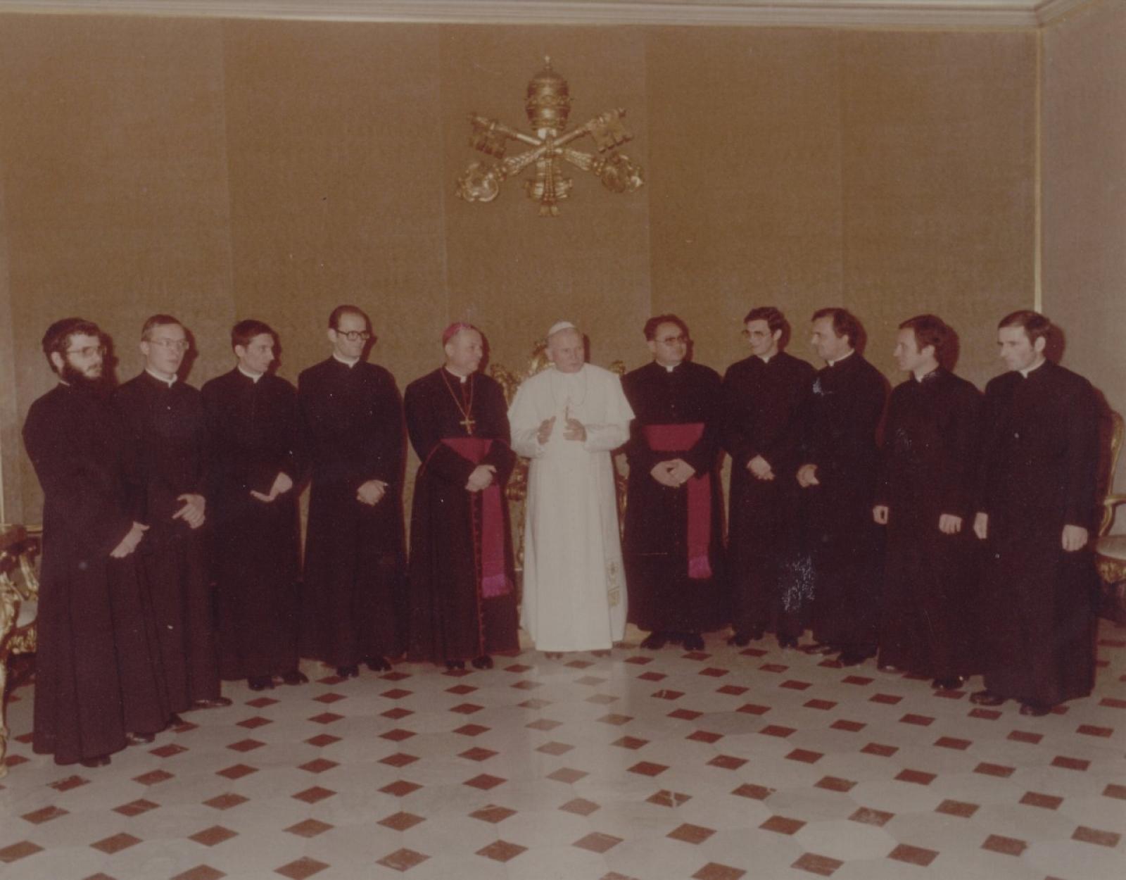 Ezek után következett el a nagy nap: 1979. november 24. Leköszönő rektorunk pápai magánkihallgatást kért, ahol bemutathatja a magyar ösztöndíjasokat is. Bizonyára nem csak én, hanem társaim is szorongva, de örömtelien vártuk a találkozást Szent Péter utódjával. Nem mellőzhetem a nevük felsorolását, mai státuszukkal: Erdő Péter (bíboros, esztergomi érsek) Ladocsi Gáspár (esztergomi segédpüspök), Pákozdi István (egyetemi lelkész, teológiai tanár), Benyik György (teológiai tanár), Sávai János (teológiai tanár), Szaradits József (ny. ezredes, tábori lelkész), Dolhai Lajos (egri rektor). – Jómagam annak tudatában, hogy szinte még semmit nem tudok olaszul, bemagoltam azt a pár mondatot, amit bemutatkozásra szántam a szentatyának. De nem is kellett több, hiszen csupán néhány pillanat állt rendelkezésre, ugyanis a rektor kísérte és segítette a bemutatkozásunkat. A pápa pedig ekkor még nem tudott úgy köszönni, mint a későbbiekben, hogy „Dicsértessék a Jézus Krisztus”. Meg még ekkor az sem villanyozhatta fel, ami későbbi találkozásaink alkalmával már igen – s felcsillant a szeme –, amikor Máriapócsot említettem neki.