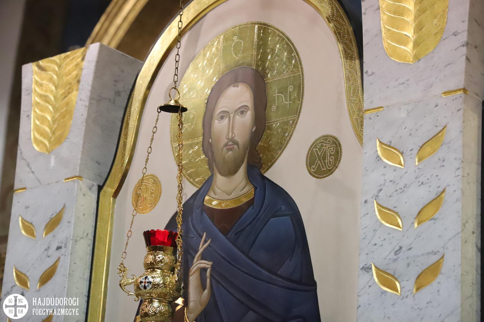 Fedezzük föl, örvendező szívvel adjunk hálát az Úr Istennek ezért a legyőzhetetlen erőért. És adjunk hálát azért is, hogy sok ikonunk van, amelyeket szemlélhetünk, amelyek mindegyike ezt erősíti bennünk. Krisztus leszállt a Földre, egyesült velünk, itt van velünk végérvényesen. Imádkozzunk azokért, akik ezt nem értik! S azokért is, akiket felbőszít a legyőzhetetlen erőnk, akik támadást, támadásokat intéznek a keresztények ellen, dühösek ránk, mert mi Krisztushoz tartozunk. Hiszen éppen ő bátorított minket előre: „Boldogok vagytok, ha miattam gyaláznak és üldöznek titeket, és mindenféle rosszat hazudnak rólatok. Örüljetek és ujjongjatok, mert jutalmatok bőséges a mennyekben. Mi a templomainkban már a mennyben érezzük magunkat. Különösen ebben a szép gödöllői templomban. Talán éppen ezért akarták elvenni tőlünk. Hála Istennek, még ha teljesen elpusztították volna is a templomunkat, a Krisztustól kapott boldogságot elvenni tőlünk lehetetlen.