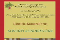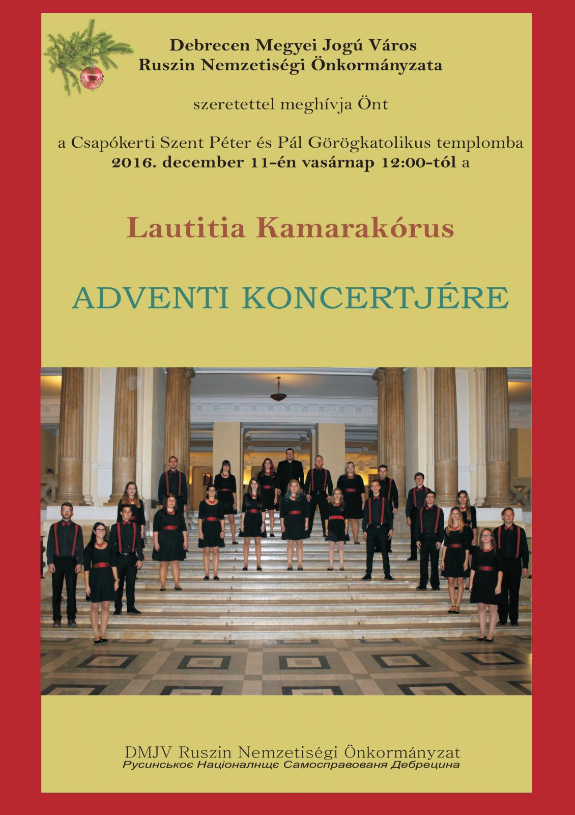 Debrecen Megyei Jogú Város Ruszin Nemzetiségi Önkormányzata szeretettel várja az érdeklődőket a Debrecen, Csapókerti Szent Péter és Pál Görögkatolikus templomba 2016. december 11-én, vasárnap 12:00 órától a Lautitia Kamarakórus Adventi Koncertjére.