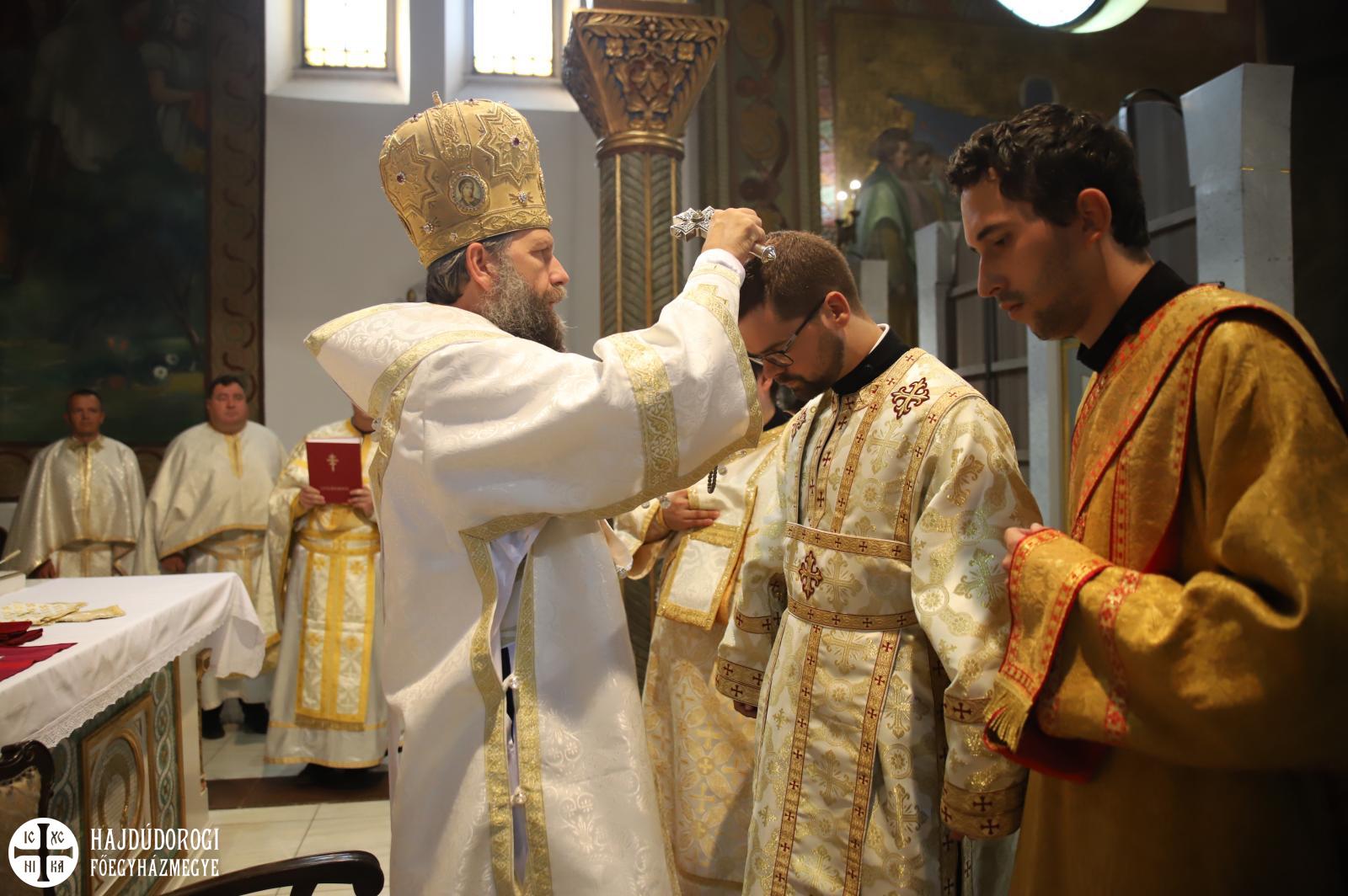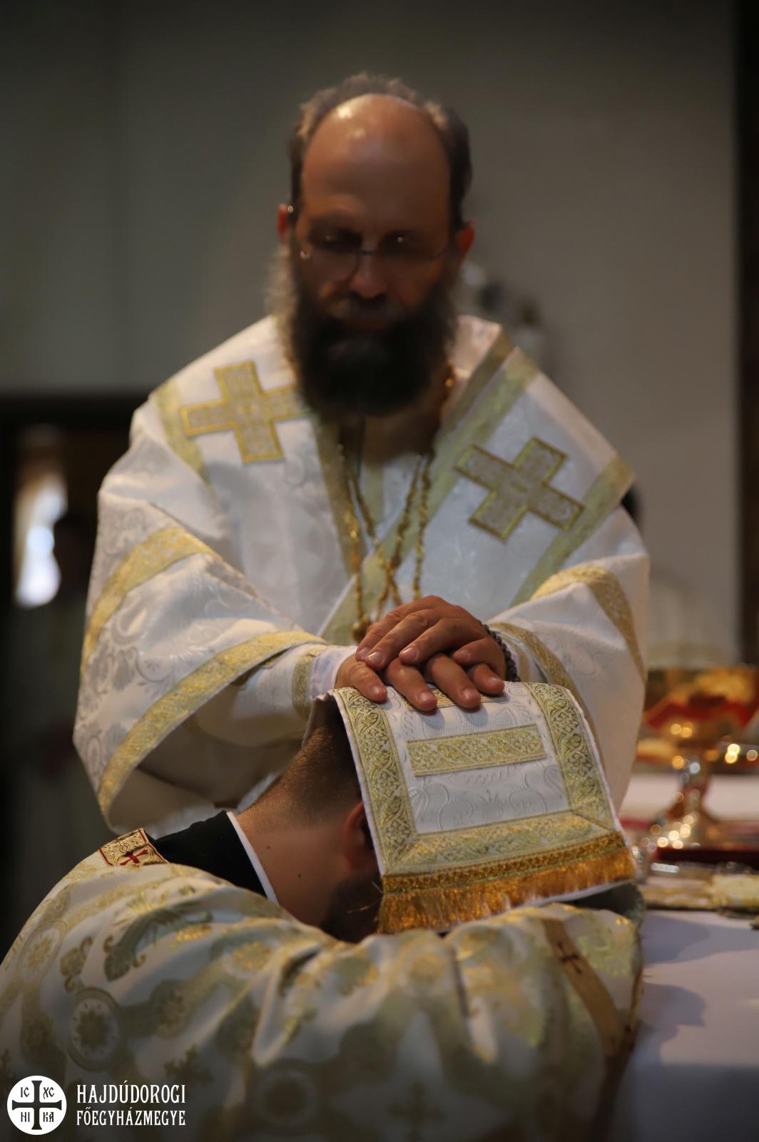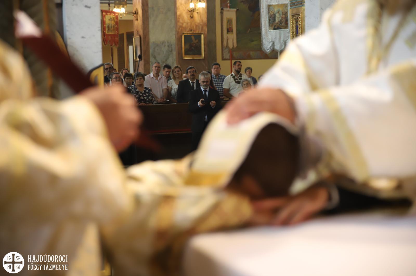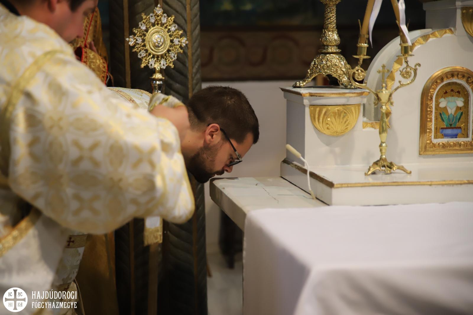 A felajánlás után alszerpap társai bekísérték Mártont a szentélyig. Ott meghajolt a püspök előtt, aki kereszt alakban megjelölte a fejét. Két diakónus vezette háromszor körbe az oltáron, melyet mind a négy sarkán csókkal illetett. Az oltár előtt térdeplő szentelendő fejét érsek-metropolita atya kezével és omoforjával befedte, ekkor kezdetét vette a főpásztor által mondott szentelési ima. Majd megkapta a diakónusi jelképeket: az oráriont, a kézelőt, a ripidiont és a tömjénezőt.