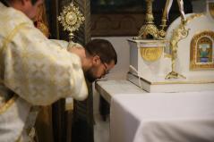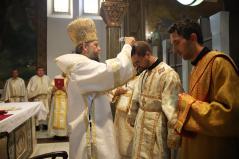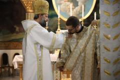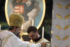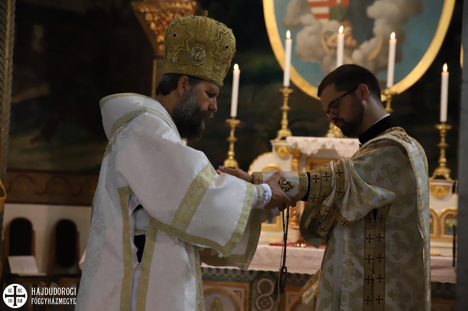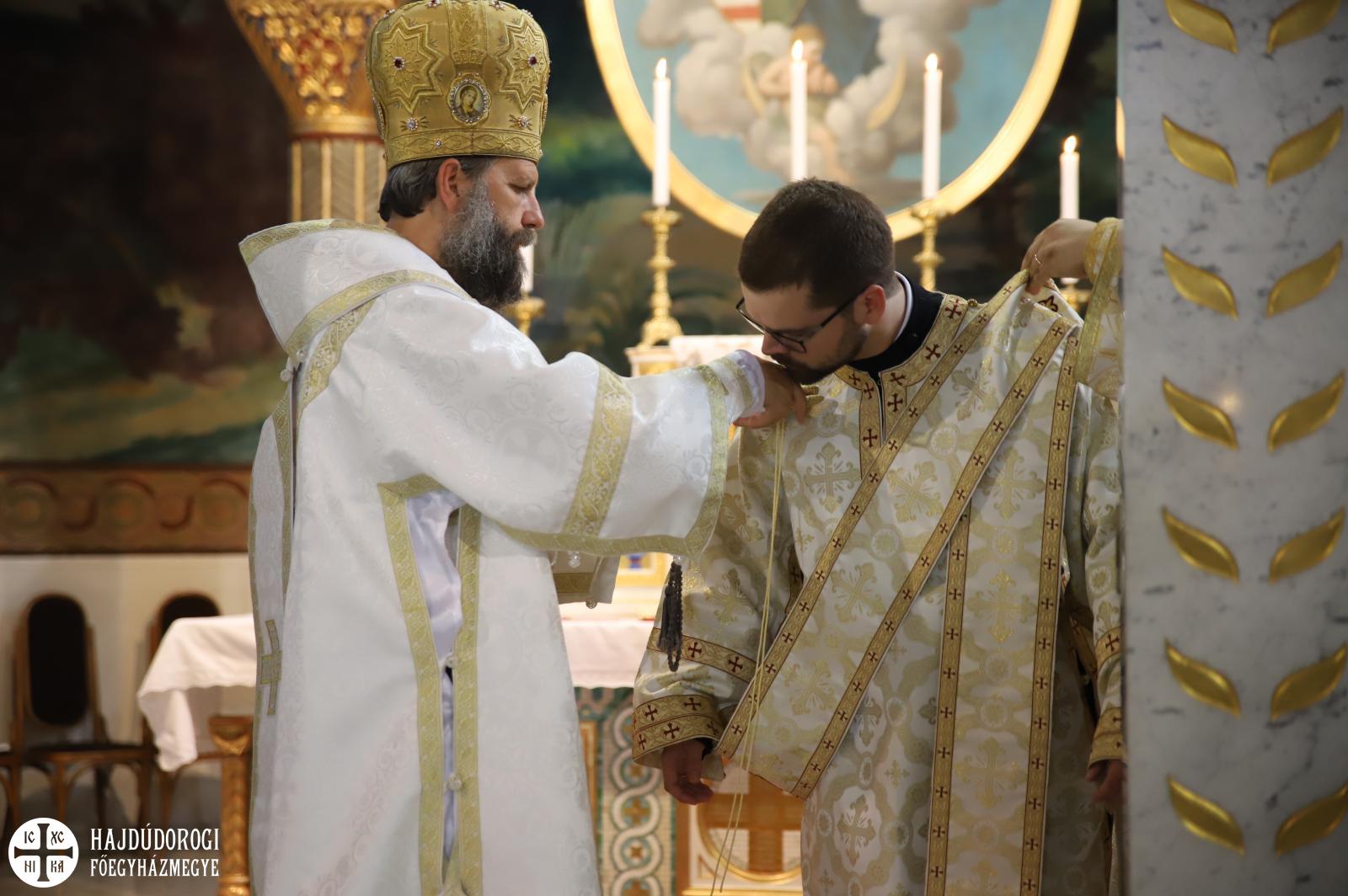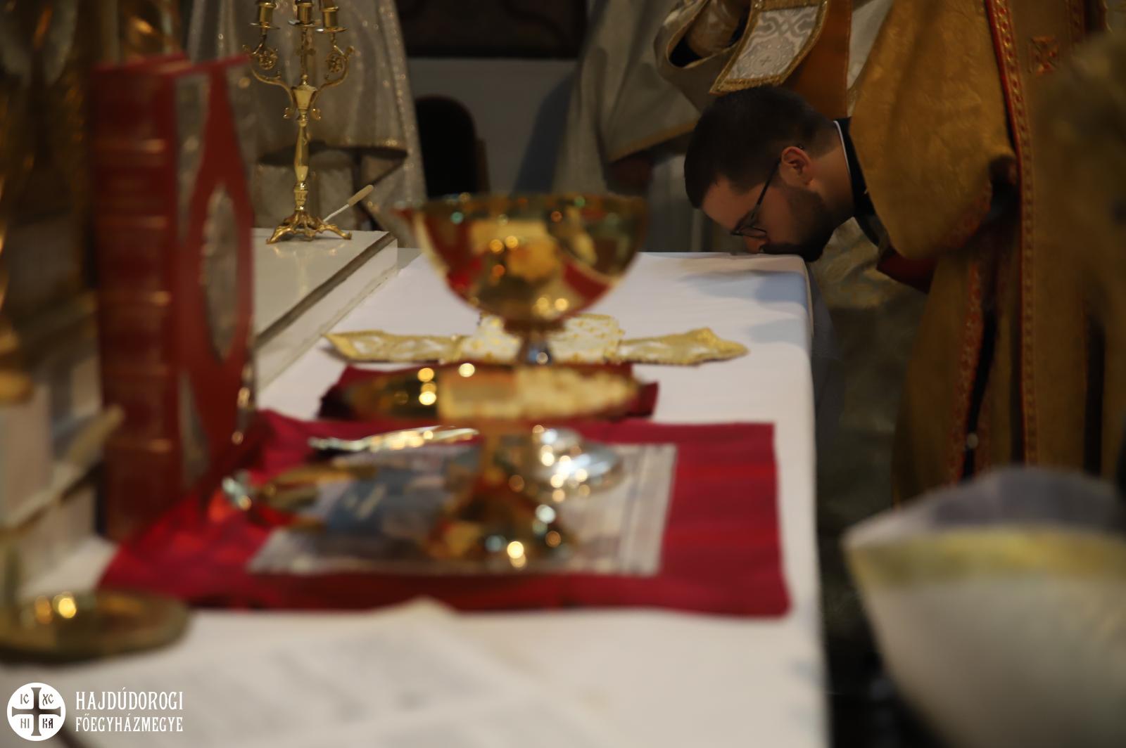 A felajánlás után alszerpap társai bekísérték Mártont a szentélyig. Ott meghajolt a püspök előtt, aki kereszt alakban megjelölte a fejét. Két diakónus vezette háromszor körbe az oltáron, melyet mind a négy sarkán csókkal illetett. Az oltár előtt térdeplő szentelendő fejét érsek-metropolita atya kezével és omoforjával befedte, ekkor kezdetét vette a főpásztor által mondott szentelési ima. Majd megkapta a diakónusi jelképeket: az oráriont, a kézelőt, a ripidiont és a tömjénezőt.