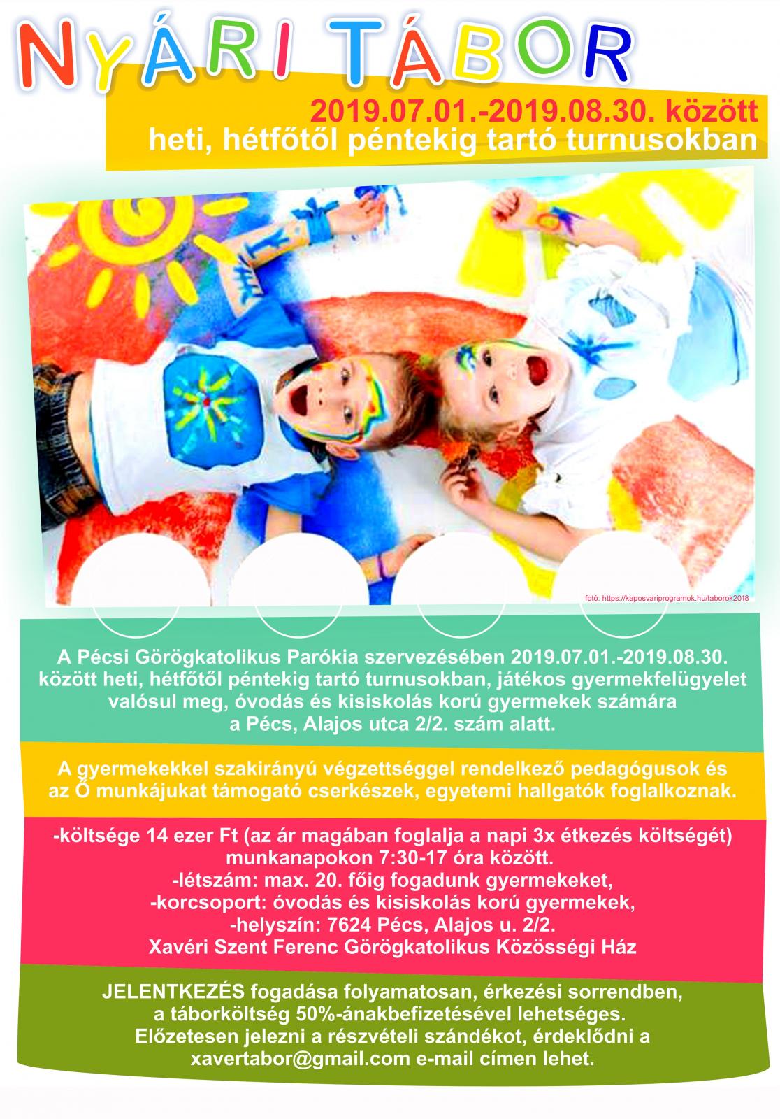 2019.07.01 - 2019.08.30 között hétfőtől péntekig tartó turnusokban biztosít játékos gyermekfelügyeletet óvodás és kisiskolás korú gyermekek számára a Pécsi Görögkatolikus Parókia.