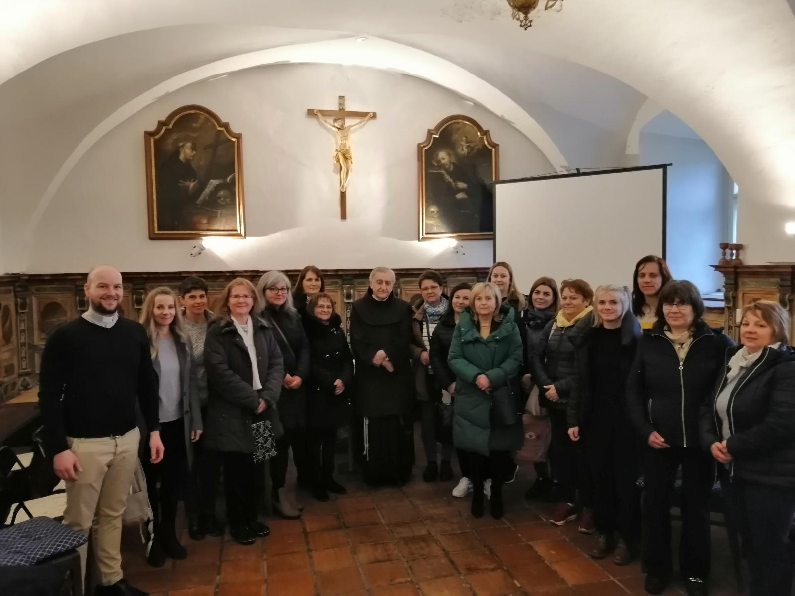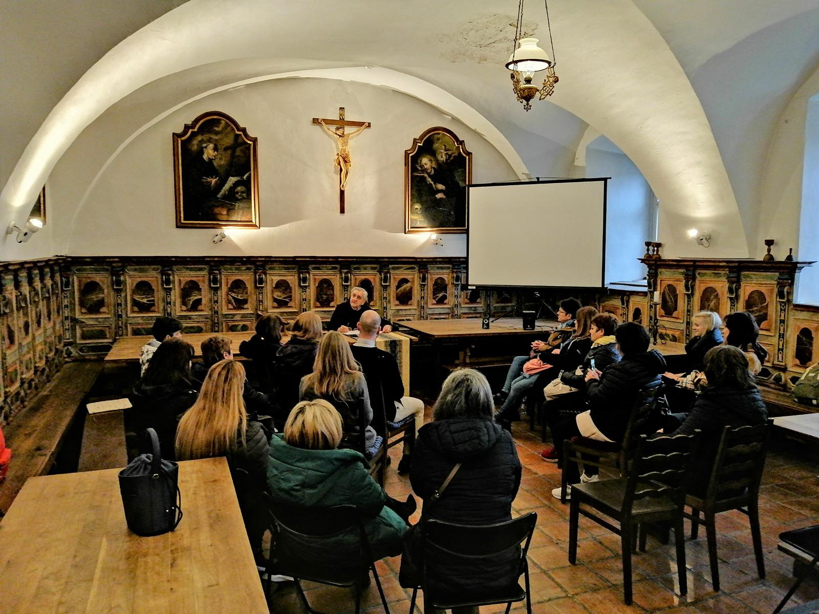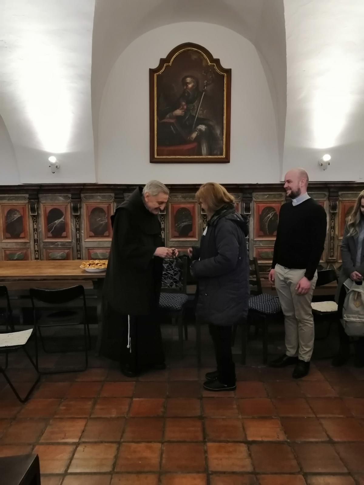 Ezután a szécsényi Ferences templom és kolostorba mentünk, ahol a nagy népszerűségnek örvendő hitszónok, Barsi Balázs atya fogadott mindenkit személyesen, majd kedves szavak kíséretében a refektóriumba invitált minket, ahol fantasztikus előadást tartott Assisi Szent Ferencről. A ferences rend alapítóját, életének fontos momentumait az életrajzíróján keresztül mutatta be, de olyan mély teológiai gondolatokkal tűzdelve, hogy olykor igen erősen kellett koncentrálni, értő figyelemmel befogadni az elhangzottakat.