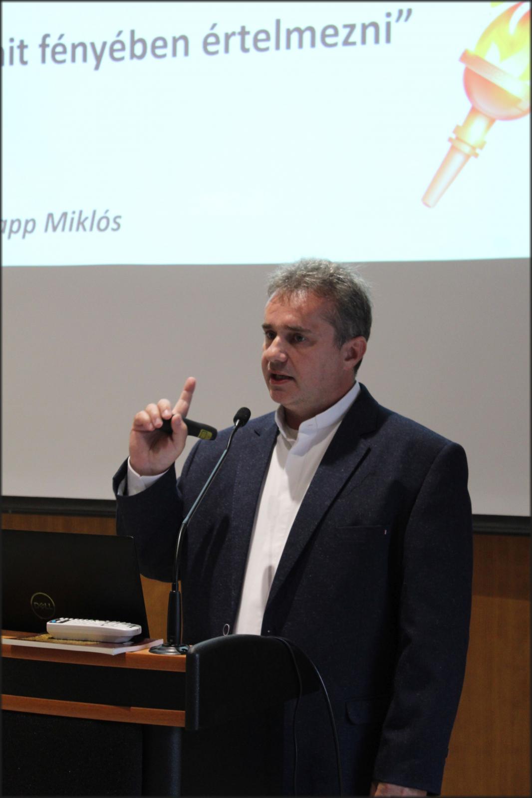 Dr. Papp Miklós atya előadásának címe „A média morális horizontja” volt, melyben megtudhattuk, hogy milyen fontos a manapság a már egyre inkább online formában megnyilvánuló kommunikáció. Miklós atya a jól ismert, magával ragadó stílusában az előadása ívét nagyszerűen felépítve mutatta be, hogy milyen (lenne) a teológiai alapokon nyugvó, helyes média kommunikációja.