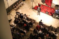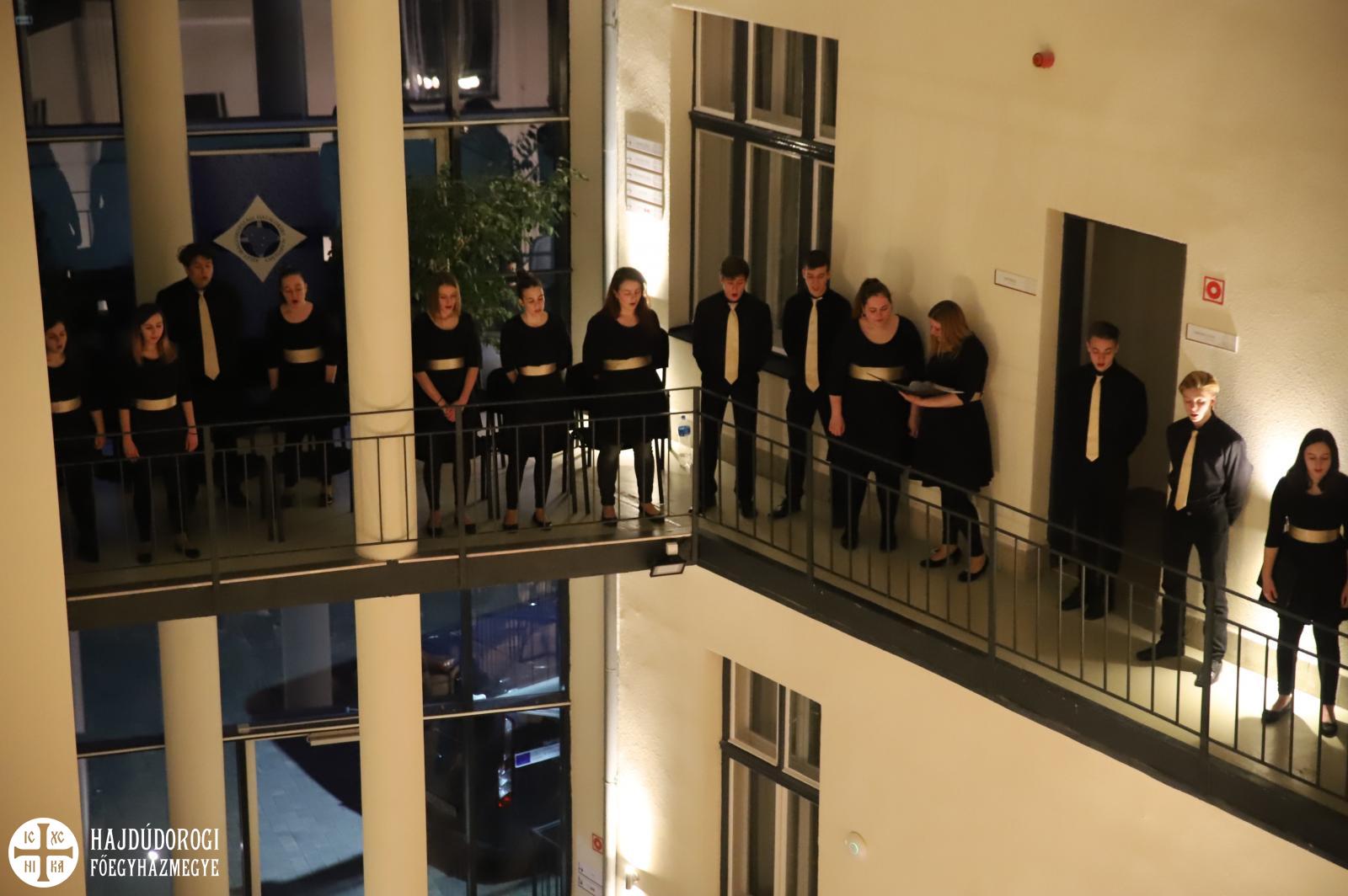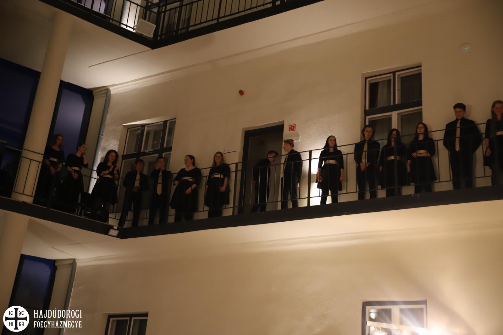 Majd a karnagy „sajátjairól” is ejtett néhány szót, melyek dagadtak a büszkeségtől. Nem csoda, hiszen az esten fellépő ifjúsági vegyeskar éppen egy hete érkezett haza Olaszországból, ahol egy versenyen ifjúsági vegyeskar és egyházzenei kategóriában is elsők lettek. Utóbbi győzelem külön öröm volt számukra, hiszen először mérettek meg ebben a műfajban. A kórus vezetője külön hangsúlyozta, hogy a fiatalok a péntek délutánjaikat áldozzák arra, hogy a Szent Efrém Iskola, Debrecen és az egyház nevét öregbítsék és mindig nagy elszántsággal vetik magukat a munkába. A kórusversenyről mi is beszámoltunk, ezt itt olvashatják Olaszországban remekelt a Lautita