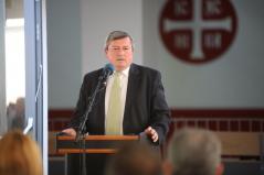 „Azért pompás dolog fára mászni, mert közben nekünk kell kitalálni, hogy tudjuk legyőzni a fát, együttműködni vele, azért, hogy minél magasabbra jussunk. Erőnlét, ügyesség kell hozzá és elszántság. Most egy sportcsarnokot áldunk meg első sorban, aminek használatához szintén ügyességre elszántságra, kitartásra, erőnlétre van szüksége a gyerekeknek.” – mondta a főpásztor, majd hozzátette: az iskola is hasonló célokat szolgál.