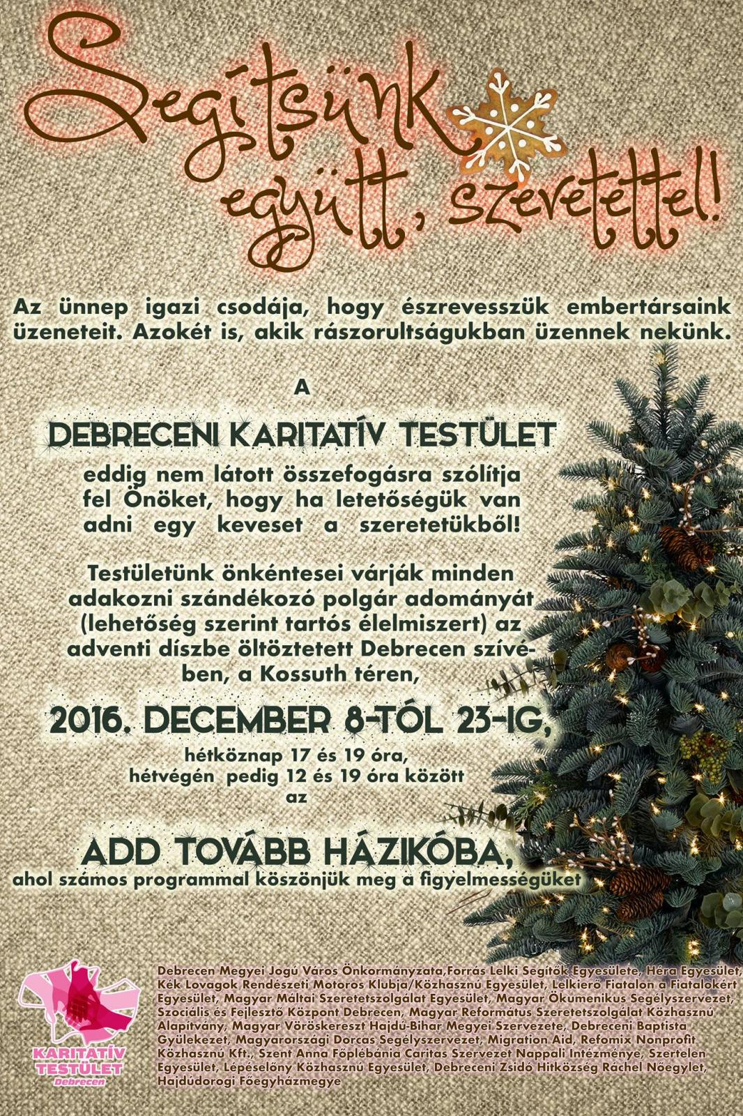 A Vox Iuventutis, vagyis a debreceni Kölcsey Ferenc Református Gyakorló Általános Iskola kórusa és a Jazz Five együttes teremtett karácsonyi hangulatot Debrecenben a Kossuth téren, ahol megnyílt az Add tovább házikó. Annak érdekében ugyanis, hogy a rászoruló gyerekeknek, családoknak, közösségeknek is örömteli legyen az ünnep, a Debreceni Karitatív Testület, az önkormányzat és több szervezet fogott össze, így a Hajdúdorogi Főegyházmegye is. A cívisvárosi akció különlegességét pont az adja, hogy többen is a karitatív testület mellé álltak: sportolók, magánszemélyek, egyesületek, önkéntesek.