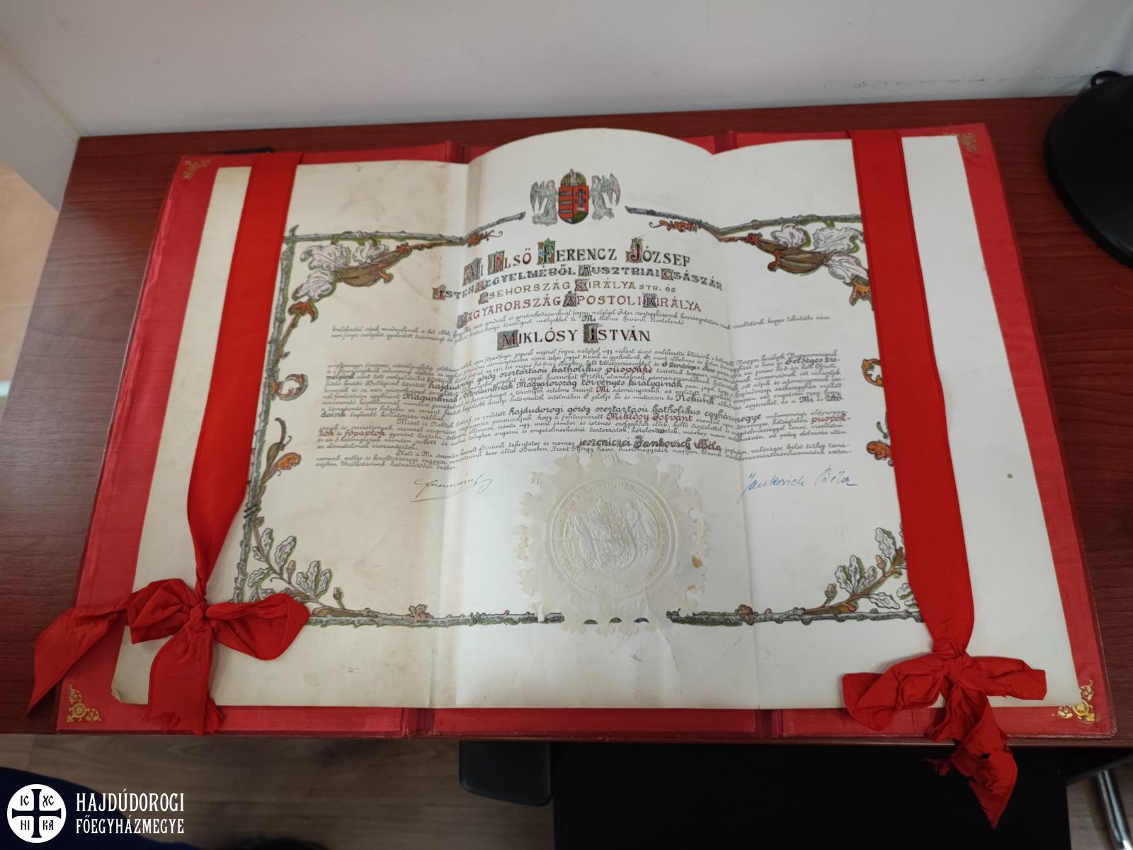 Az újonnan felállított Hajdúdorogi Egyházmegye első püspökévé az uralkodó Miklósy István, sátoraljaújhelyi parókust nevezte ki, kinek felszentelése 1913. október 5-én Hajdúdorogon volt. (Forrás: Véghseő Tamás atya, a Hajdúdorogi Főegyházmegye rövid története)