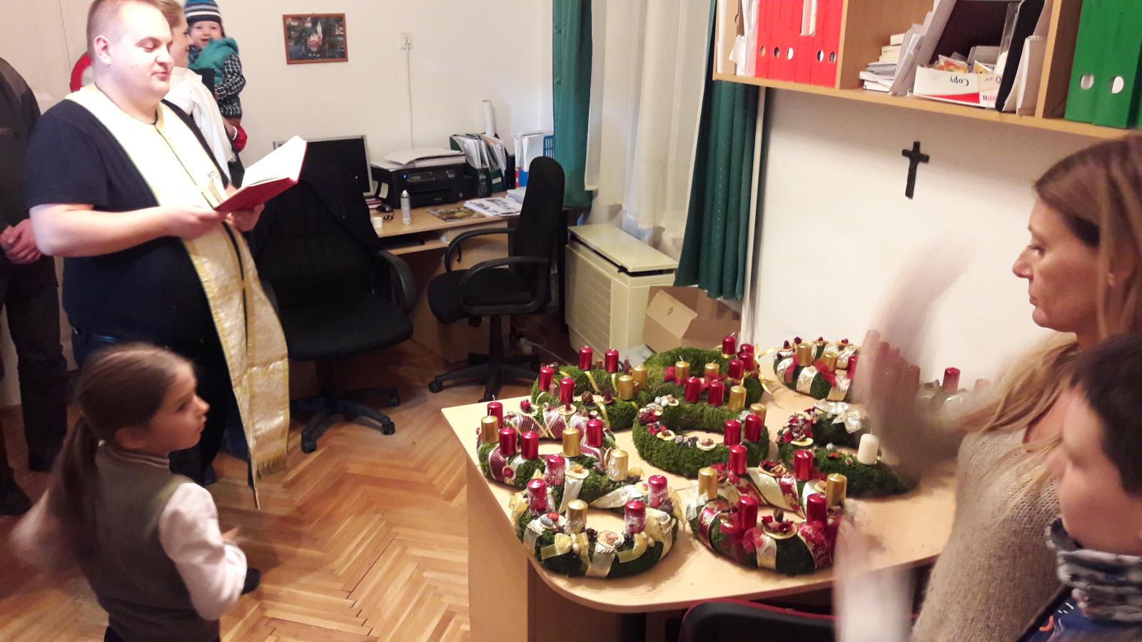 November 16-án, pénteken, karácsonyi készületünk elején parókiánk családjai, hívei 90 adventi koszorút készítettek a Szent Miklós teremben, amelyeket megáldottunk, s otthonainkba haza is vittünk.