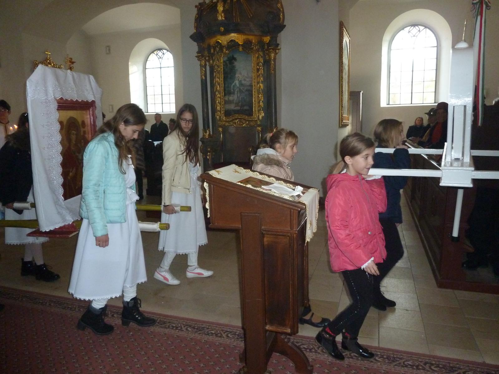 Továbbá emelte az ünnep fényét az oltárszolgálatot végzők száma is: Tóth Lóránt diakónus felkérésére az Apák Köréből néhányan gyermekeik mellett ministráltak, jelentőségteljesebbé téve az asszisztenciát kispapjainkkal együtt. A képvivő lányok egy karban helyet foglalva – később a körmeneten hordozva a Mária-képeket – fegyelmezetten, áhítattal hallgatták az elhangzó szavakat.