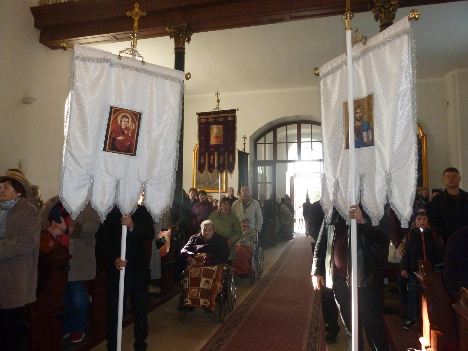 A liturgia végén Érsek atya megszentelte a hajdúdorogi zászlók másolatait. Egykor ezekkel harcoltak őseink a magyar Szent Liturgiáért és a magyar püspökségért.