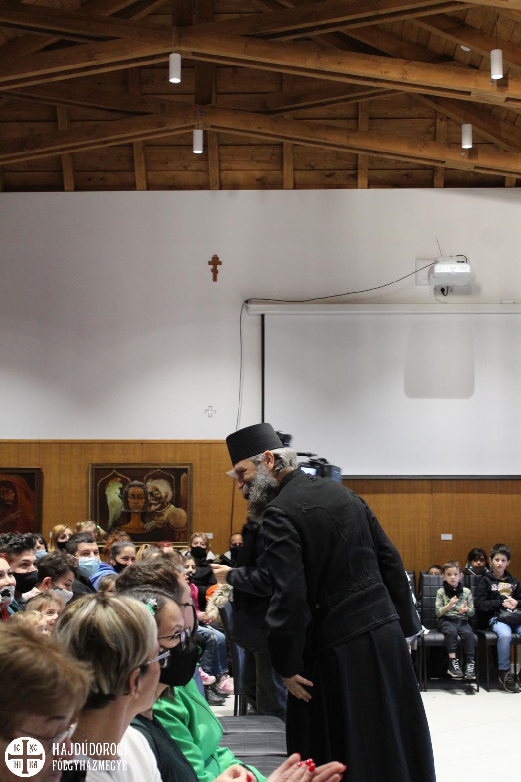 – Mindent a Jóisten nevében kell kezdeni, mert ha nem így teszünk, akkor félő, hogy a nagy sikerek elbolondítanak bennünket és azt hisszük, amit teszünk, azt a saját erőnkkel, fejünkkel és elhatározásunkból csinálunk. Amikor valami jót akarunk tenni, akkor ő indít minket arra, hogy azt megtegyük - fogalmazott Fülöp metropolita atya az adományátadó ünnepségen. A szülőknek és gyerekeknek egy példatörténetet is elmesélt egy hadifogolyról, aki a fogolytáborban egy krumpliba állított, keresztet formáló gallyból készített karácsonyfával tartotta a lelket társaiban.