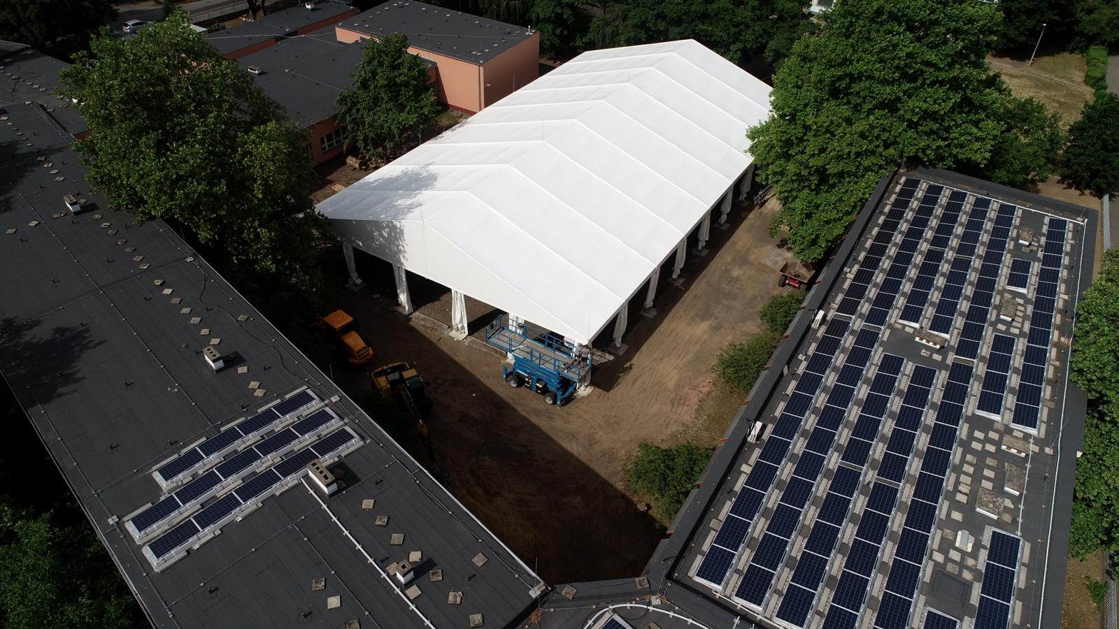 A sátorban egy 198 fő fogadására alkalmas acélszerkezetű lelátó is helyet kap. A sátor tetőborítása levegő befúvásos, dupla rétegű, szigetelt ponyva, amely a nyári melegben kellemes árnyékot ad a használat során.
