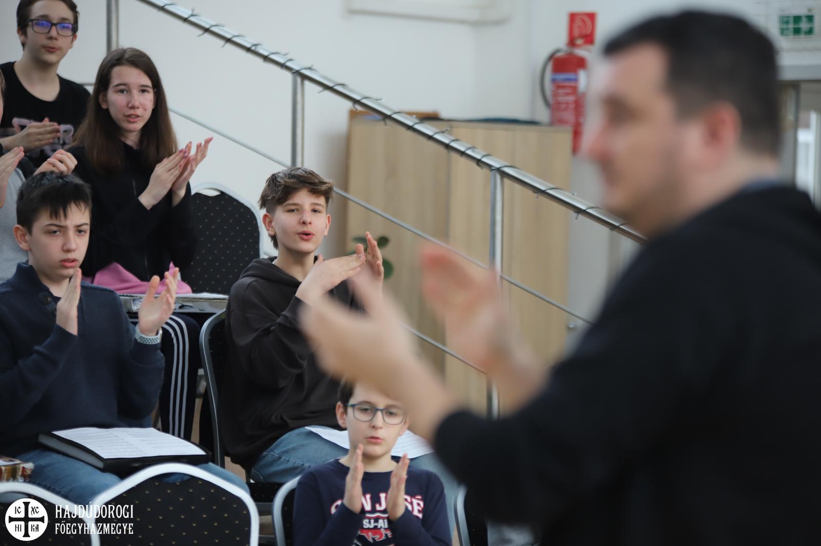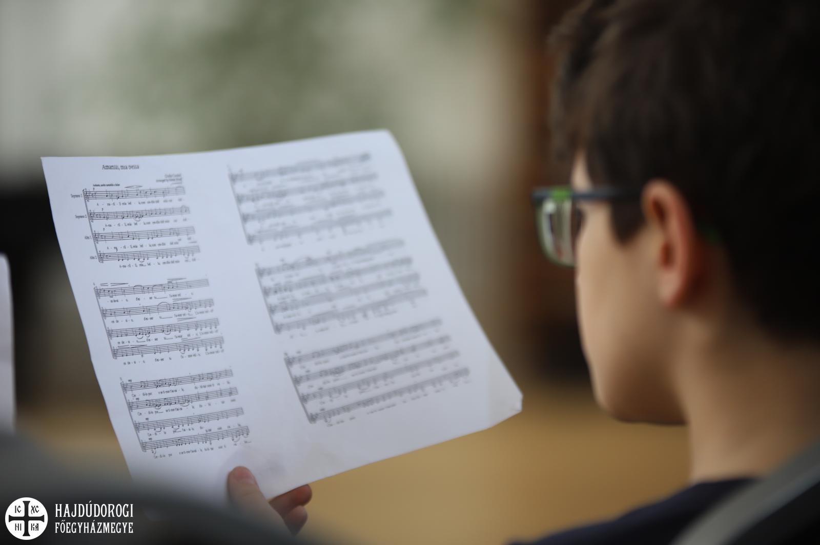 Az ifjúsági gyerekkar szokásos hétfői próbáján látogatom meg a karnagyot, a díjátadó után néhány nappal. „Józsi bácsi” a tőle megszokott hőfokon ég, nyoma sincs hét eleji kedvtelenségnek vagy motiválatlanságnak. Biztosan a rangos elismerés miatt van még inkább feldobva a karnagy, – gondolom én – aki éppen arra buzdítja tanítványait, hogy gyakoroljanak, ahol csak kedvük támad. Akár a buszmegállóban sem ciki.