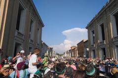 A Szentatya érkezése előtt a téren gyülekező csapatok a különféle országok bemutatkozó előadásait tekinthették meg. Szerencsére nekünk is sikerült jól elhelyezkedni, így néhány perccel 18:00 után – amikor feltűnt a kordonok között a pápamobil – magunk is csupán néhány méterről láthattuk Szent Péter utódát, Ferenc pápát, aki nagy szeretettel köszöntött bennünket. Majd elmondta, mennyire fontos a mi, ministránsok szerepe az Egyház életében, hiszen a mai fiatalok között mi vagyunk azok, akik a hétköznapokban is, az Oltár körül vállalt szolgálatunkkal teszünk tanúságot Krisztus Urunk mellett...