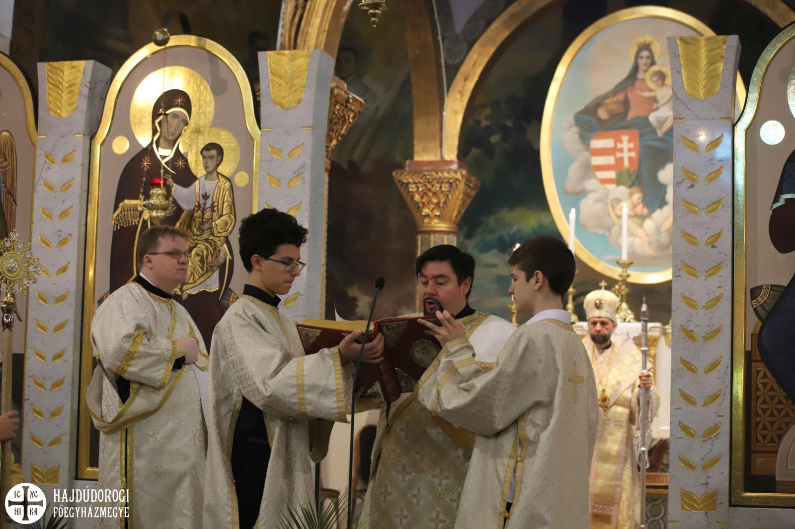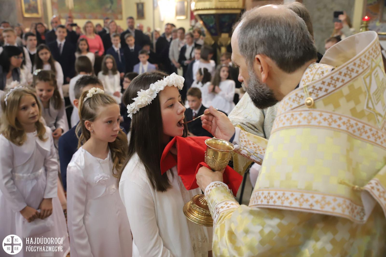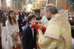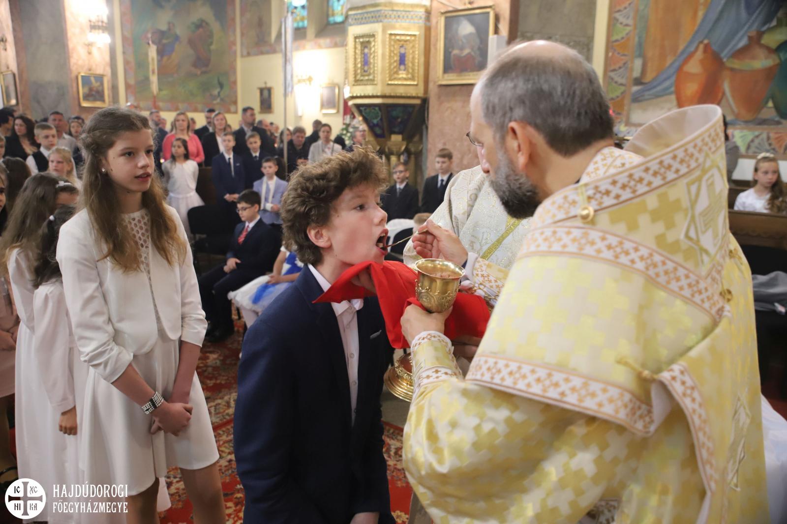 „Mi is az Eucharisztia? Krisztus Teste és Vére, amelyet magunkhoz vehetünk. Ezt kapjuk itt, az isteni lakomán, valójában ezért jövünk ide a templomba, hogy ebből a mennyei táplálékból részesülhessünk. Itt is van asztal, az oltárasztal, amelyre kenyeret és bort viszünk föl. S itt is történik valami hatalmas csoda, pontosan olyan nagy, mint ami az üres sírnál történt, amikor Krisztus föltámadt.” – mondta érsek-metropolita atya és reményét fejezte ki annak kapcsán, hogy az első szentáldozásban részesülők megtettek minden tőlük telhetőt az Úrral való találkozásért.
