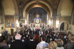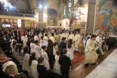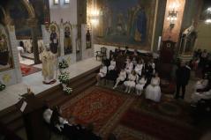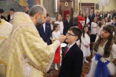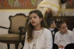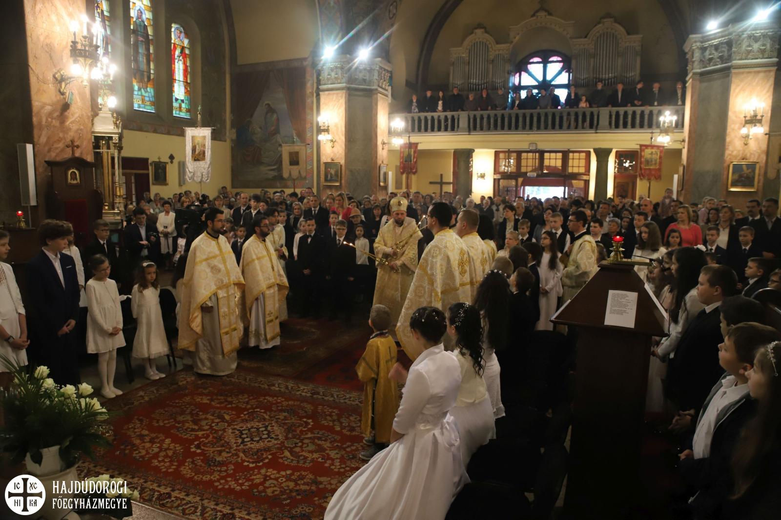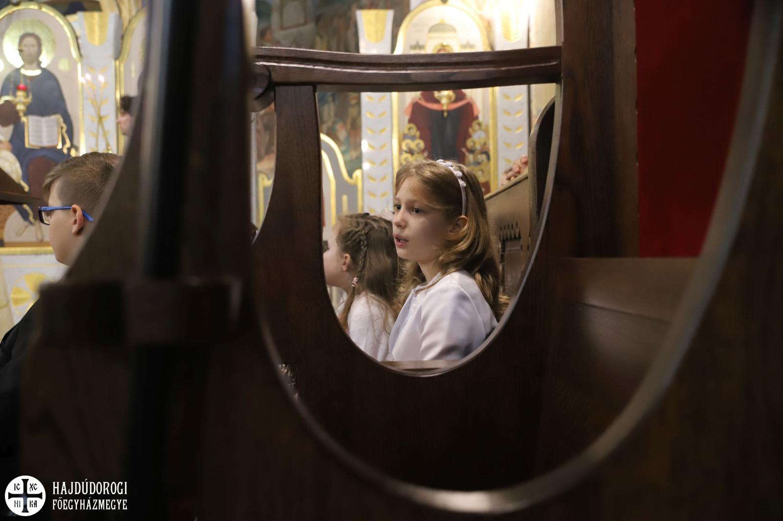 A hatvanhét gyermek áldoztatását érsek-metropolita atya végezte, majd a szertartás végén a szülők kezüket gyermekük fejére helyezve anyai és atyai áldásukat adták elsőáldozó fiukra vagy lányukra.