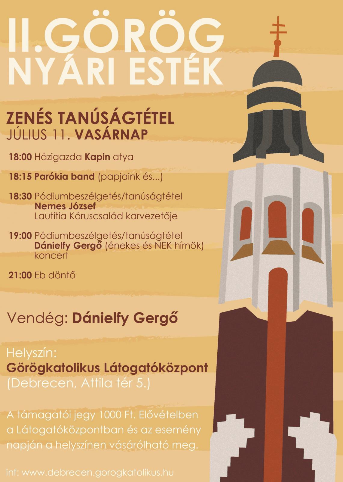 Hagyományteremtő szándékkal indította útjára a Görög Nyári Esték programsorozatot tavaly a Debreceni Görögkatolikus Parókia. Az idei első nyáresti találkozás az Európa Bajnokság döntőjének napján lesz, így Dánielfy Gergő koncertje után közös szurkolásra is invitálják a kedves testvéreket. Részletek a plakáton.