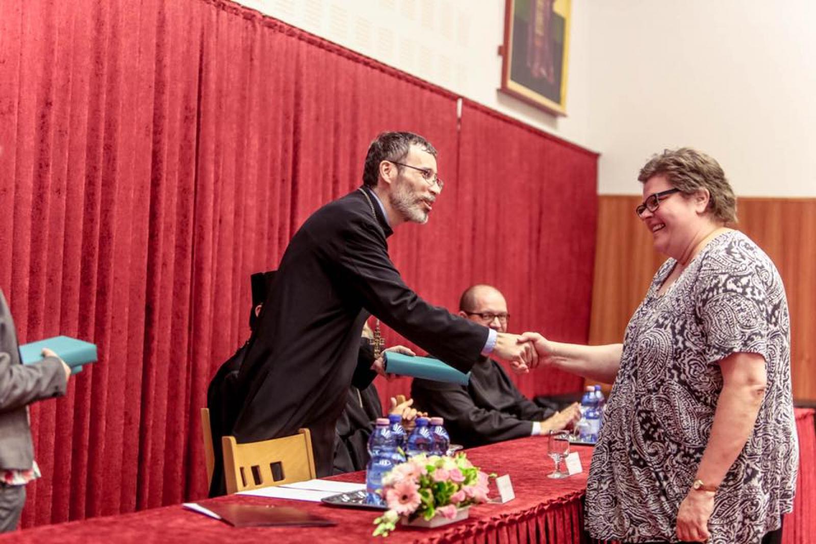 A levelező tagozaton végzett katekéta és hittanár-nevelőtanár mester szakot végezett hallgatóknak az igazolásokat és diplomákat Seszták István rektor-helyettes atya adta át. A diplomaosztó az Atanáz-díj átadásával folytatódott, melyet Szocska A. Ábel püspök atya ebben az évben dr. Fodor György atyának adott át. Fodor György atya pappá szentelése óta eltelt harmincnégy évben mindig azon fáradozott, hogy római és görögkatolikus papi nemzedékek, civil teológusok, hittanárok és a hit iránt érdeklődők teológiai végzettséget szerezhessenek életpályájuk megvalósításához. Főigazgatói, rektori és különféle elnökségi feladati mellett diplomáciai érzékével kapcsolatos megbízásokban is fontos szerepet vállal. Az intézmény legrangosabb kitüntetésével fejezték ki elismerésüket, hálájukat és köszönetüket azért, amit a magyar görögkatolikus egyházért és intézményeiért tett.