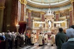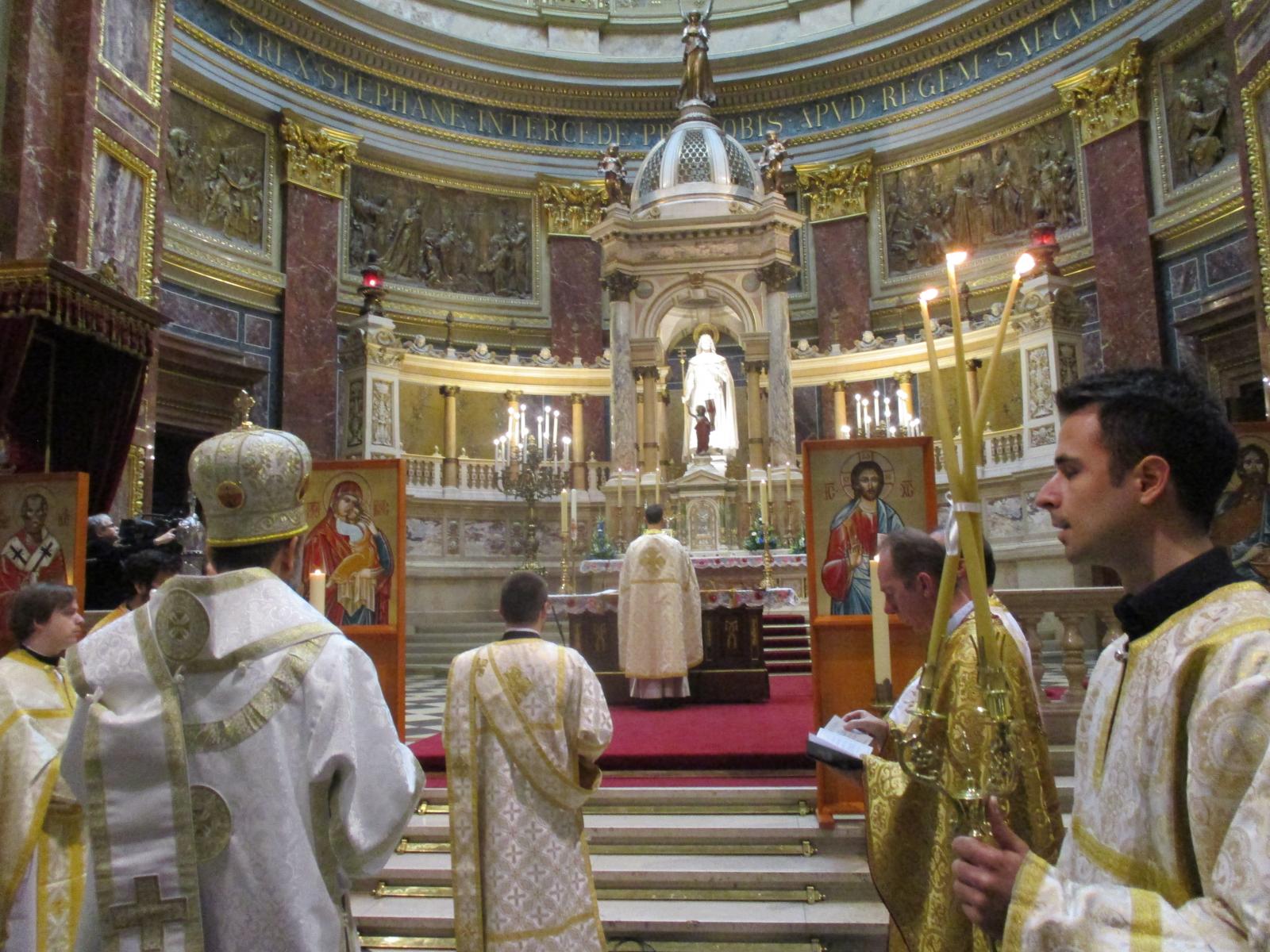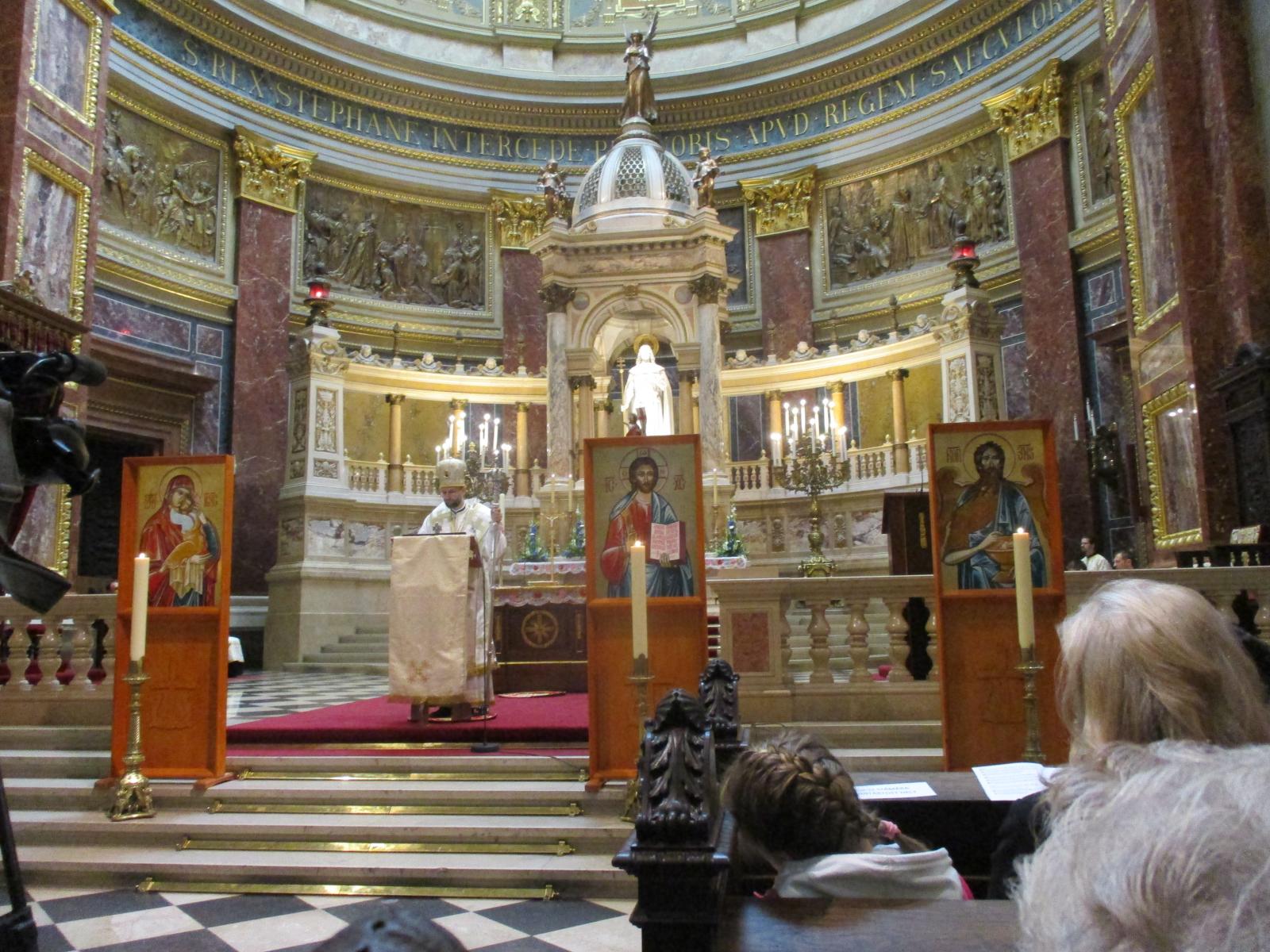 A bazilika előtti téren igazi görögkatolikus hangulatban találkozhattak a híveink egymással, a főpásztorral: részesülhettünk egy jó pohár borban, vásárolhattunk az újonnan megnyílt görögkatolikus kegytárgybolt kínálatából, s istenadta verőfényes jókedvben beszélgethettünk egymással úgy, ahogy őseink mindig is tették a templom előtt.