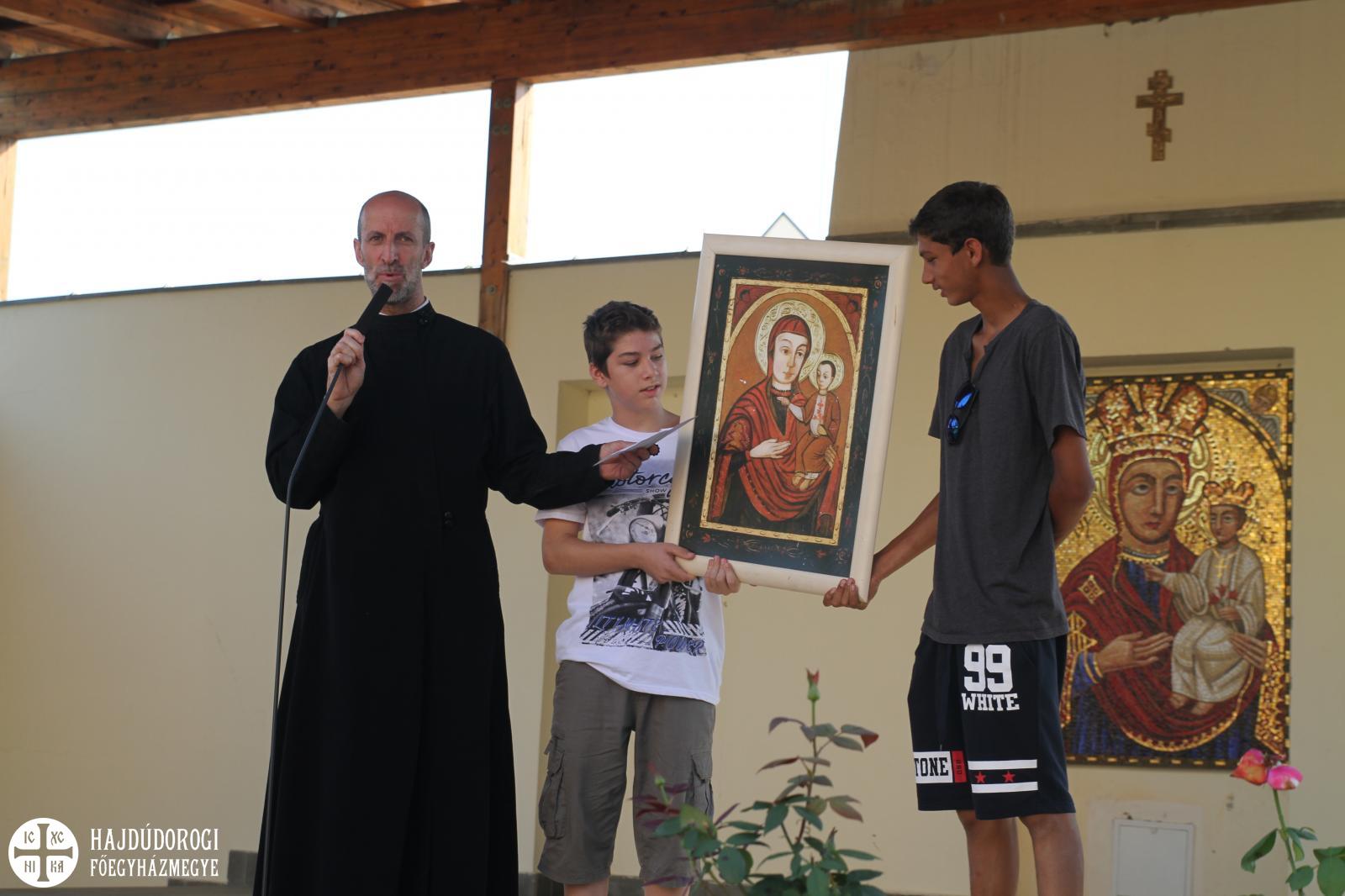 Ezzel kapcsolatban egy érdekes történetet mesélt el Fülöp atya. Egy gazdag ember fia éppen a 18. születésnapját töltötte be, ajándékként egy drága autót szeretett volna kapni. Eljött a születésnap, és a kis csomagban, amit kapott, nem volt más, mint egy Biblia. A fiú nagyon csalódott volt. Nem kapta meg a drága négykerekűt, hanem csak egy Bibliát!? Dühös volt, hogy lehet ilyen az apja? Ott is hagyta a szülői házat, elment és szerencsét próbált. Évek múltán ment csak vissza hozzájuk, a fiú azt mondta az apjának: emlékszel? Amikor egy kicsi ajándékot szerettem volna, emlékszel? Csak egy Bibliát adtál nekem. Drága fiam, mondta az apja, ha azt a Bibliát kinyitottad volna annál a résznél, ahol a tékozló fiú története van, ahogyan visszafogadja az apa a fiát…ott volt bele rakva a drága autó kulcsa. De te nem nyitottad ki. „Így vagyunk mi is Isten ajándékaival. Kapunk egy csomagot, nem bontjuk ki, csak megyünk tovább. Bontsuk ki mindig bátran, néha nehéz dolgok is vannak benne, de mindig a legjobb ajándékot kapjuk a jó Istentől. Most azért is vagyunk itt Máriapócson, hogy rá tudjunk hangolódni az új ajándékokra, amit szeptembertől az iskolakezdés tartogathat.”
