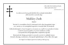 Az emberszerető lsten gondviselésében bízva tudatjuk mindazokkal, akik ismertek és szerették, hogy Makláry Zsolt ikonfestő életének 55. esztendejében, hittel és türelemmel viselt, súlyos betegségének végén 2022. március 31-én szentségekkel megerősítve visszaadta lelkét Teremtőjének.