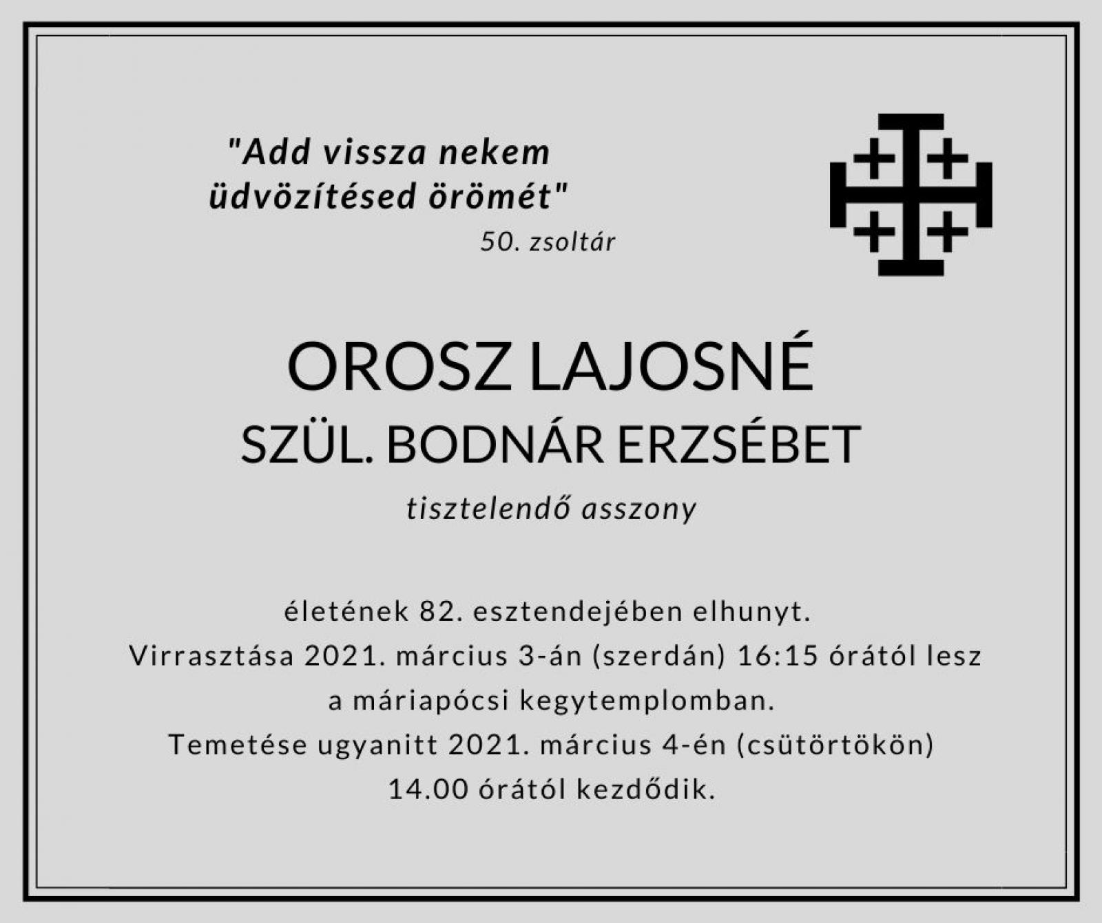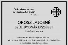 Elhunyt Orosz Lajosné (szül. Bodnár Erzsébet) tisztelendő asszony