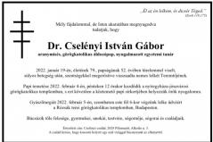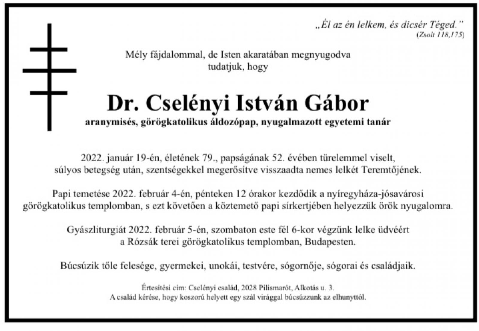 Dr. Cselényi István Gábor atya, aranymisés áldozópap, nyugalmazott egyetemi tanár, parókus, életének 79., papságának 52. évében türelemmel viselt, súlyos betegség után szentségekkel megerősítve visszatért a Mennyei Atya házába.