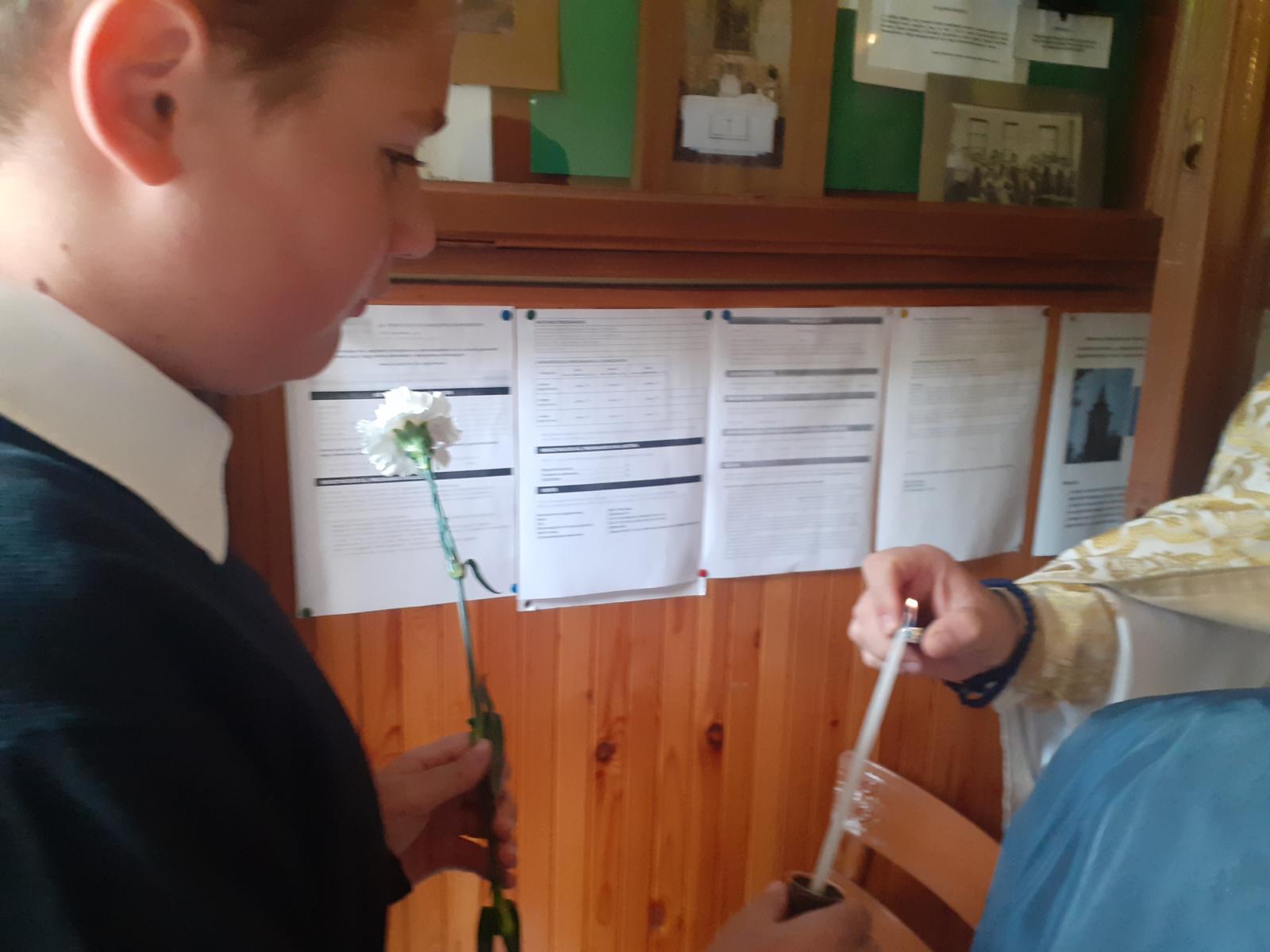 Parókus atya prédikációja elején nagyon sok szeretettel köszöntötte az elsőáldozó gyerekeket. Beszélt a virág és a gyertya szimbólumáról, a tisztaságról, melyet ezek jelképeznek, hiszen a fiatalok előzőleg részesültek első alkalommal a bűnbánat szentségében. Teljesen tisztán és ártatlanul jelentek tehát most meg, követve a fényt, mely Krisztus, a világ Világossága, aki ezt a fényt a szívünkbe teszi, aki értünk áldozta fel magát a kereszten, ahogy a szentelt gyertya is elég az oltárra helyezve.