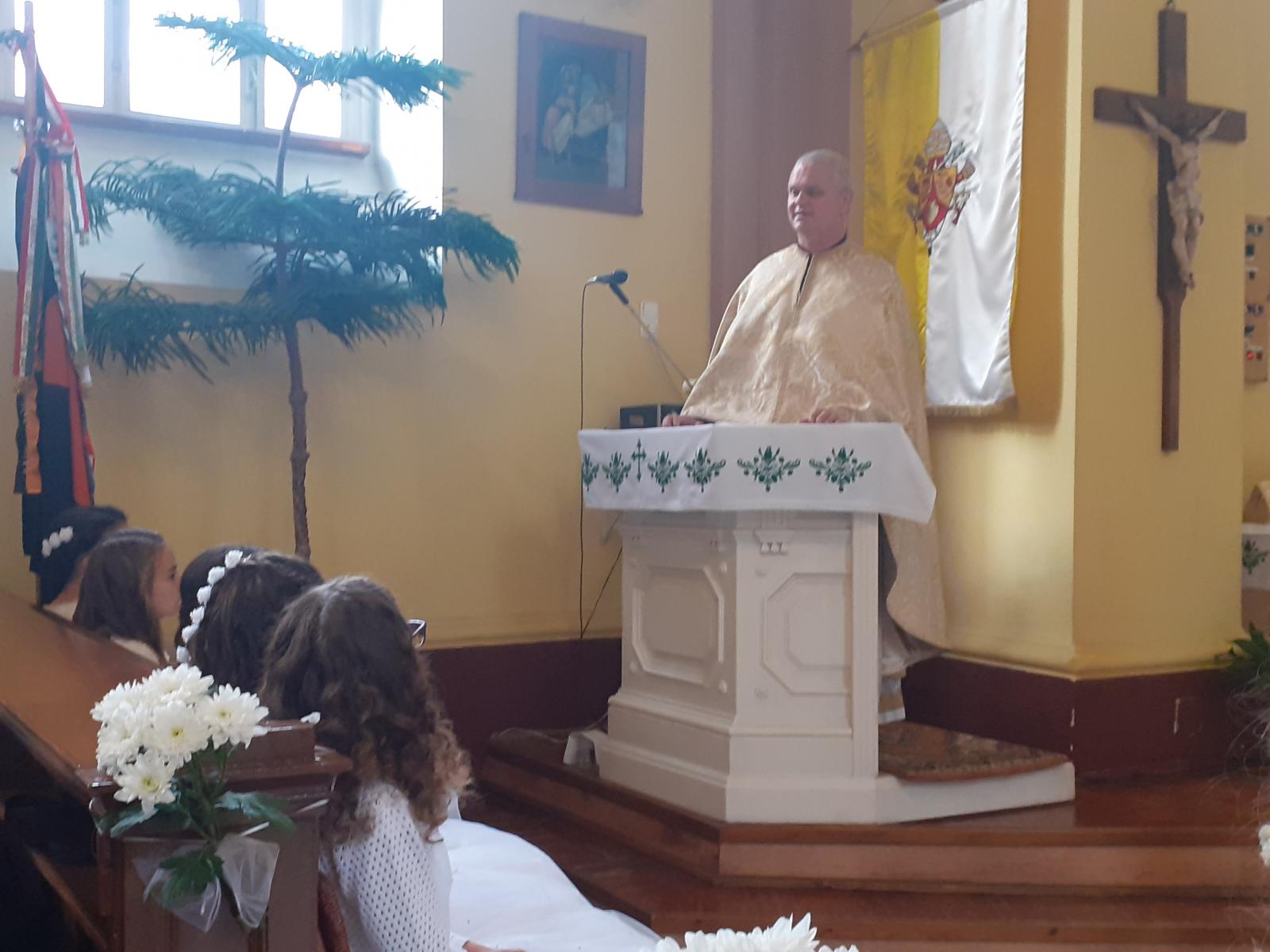 „Csoda fog nemsokára történni. Hiszen ma magunkhoz fogjuk venni Jézus Krisztust. Bízom abban, hogy nemcsak ma, hanem még nagyon sokszor akarunk Krisztussal egyesülni, hiszen Pál apostol szavai szerint ti az élő Isten temploma vagytok. Isten azt mondja, hogy közöttünk fog járni és mi az Ő népe leszünk. „Én magamhoz fogadlak titeket, és atyátok leszek, s ti az én fiaim és leányaim lesztek, mondja a mindenható Úr” (2Kor 6,18) – idézte atya az apostoli szakaszt. Majd folytatta: „Ünnepelni jöttünk ide a templomba, mert nagy ünnep az, hogy a gyerekek első alkalommal járulnak szentáldozáshoz.