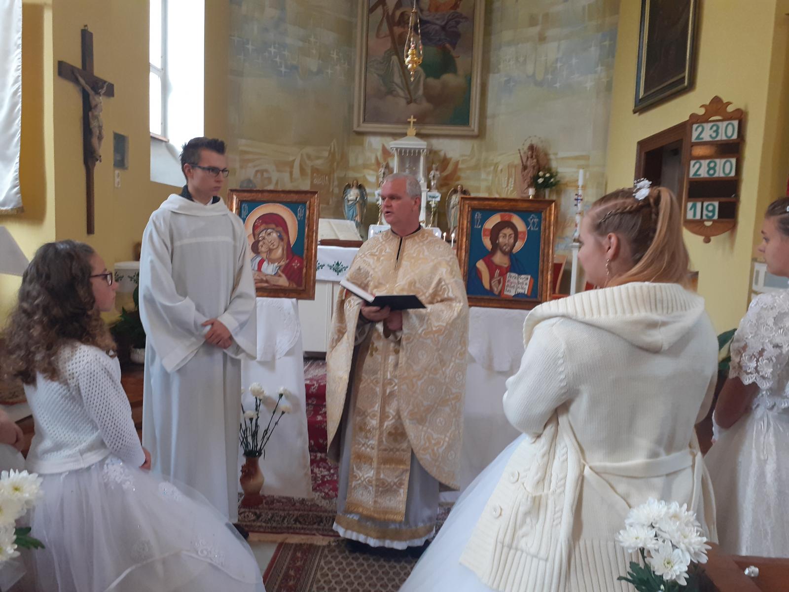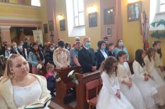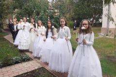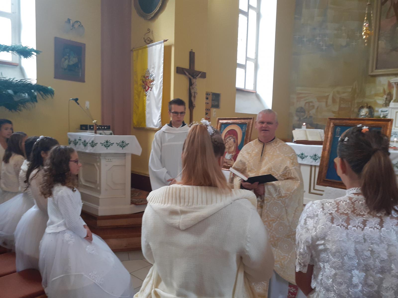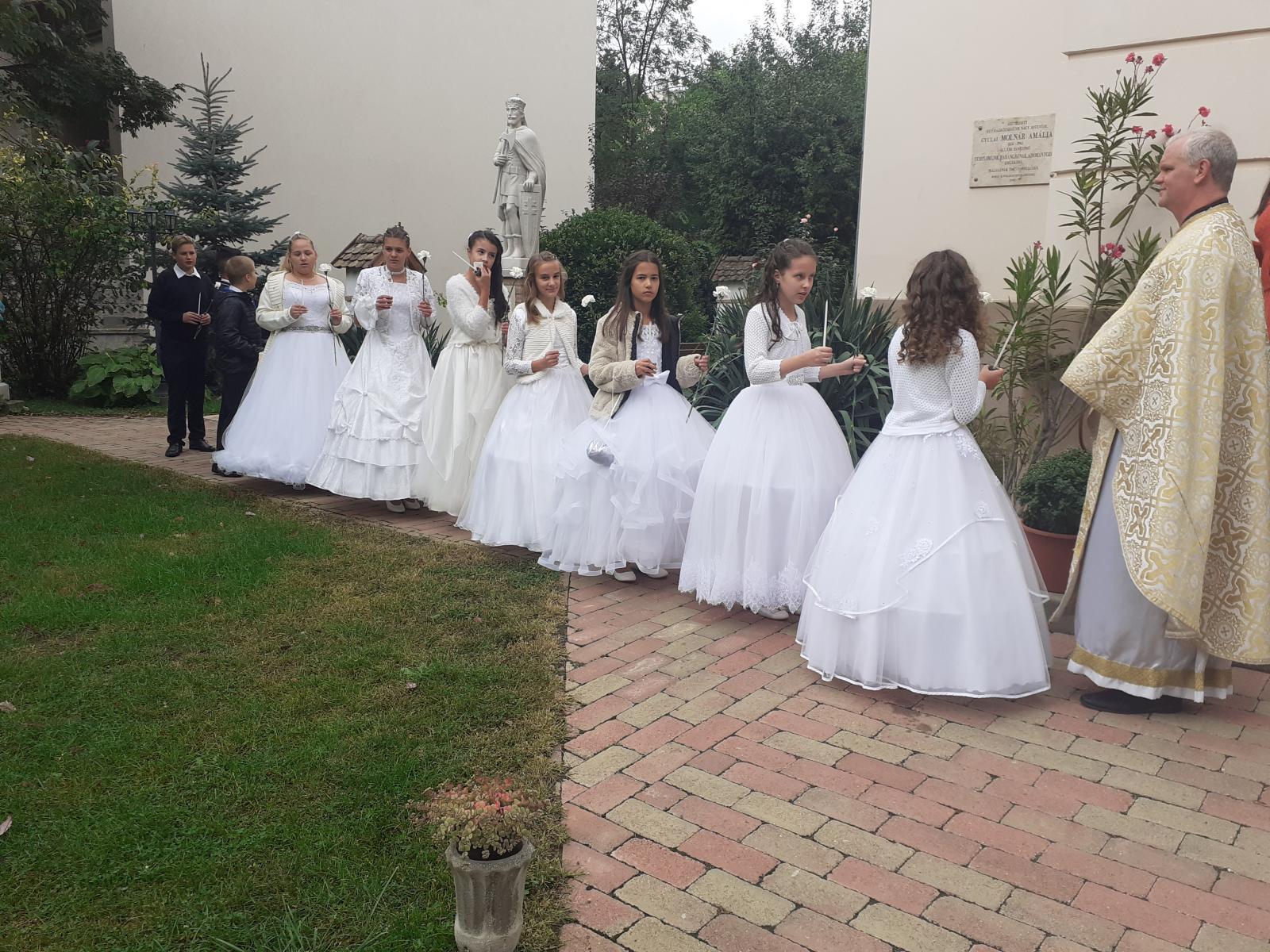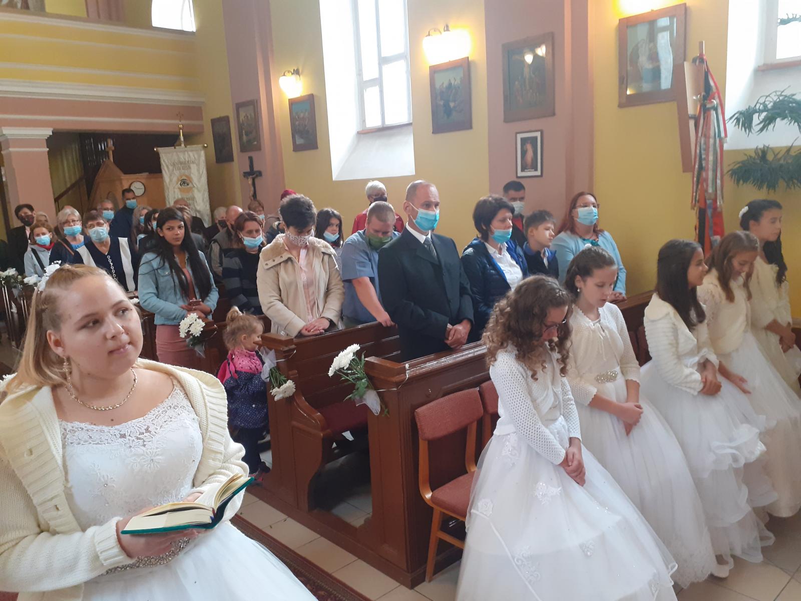 A pandémia miatt az elsőáldozók sem teljes létszámban jelentek meg, voltak, akik a járvány időszaka után szeretnének részesülni az Eucharisztia szentségében. Viszont voltak, akiket ezek a viszontagságos körülmények sem tántorítottak el attól, hogy gyönyörű ruhában egy szál fehér virággal és egy égő gyertyával az Úr asztalához járuljanak. Az ő vidám kis csicsergő hangjuk köszöntötte a templomba érkezőket. Bevonulásukkor zengett a római katolikus templom, melyet bőségesen megtöltöttek a görögkatolikus hívek. A szabályok betartásával folyt a liturgia: az ajtóban maszkokat osztogattak és kézfertőtlenítőt adagoltak Gergely atya kis segítői.