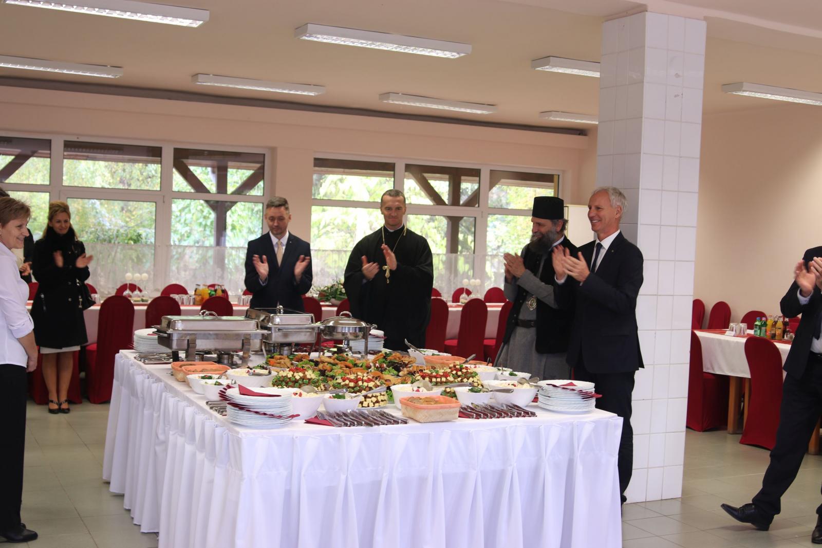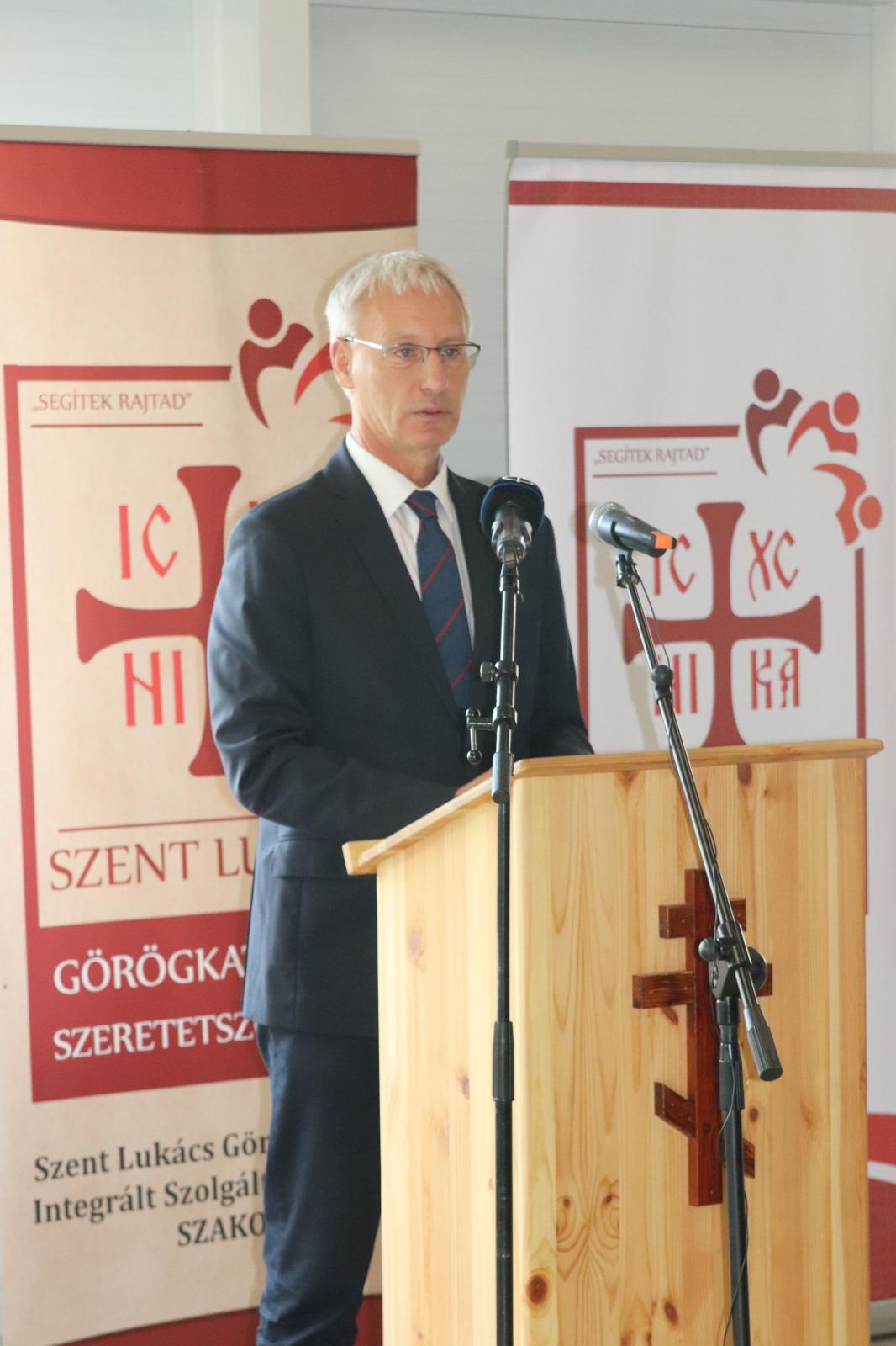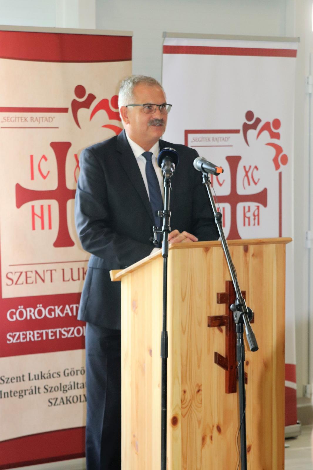 Az ünnepi beszédet Soltész Miklós, a Miniszterelnökség egyházi és nemzetiségi kapcsolatokért felelős államtitkára mondta, aki nagyobb kontextusba helyezve a mai ünnepséget, beszámolt arról a karitatív tevékenységet végző egyházak és szervezetek támogatását átfogó koncepcióról, melynek része a ma átadott épület is. Az elmúlt években ebben a projektben több mint harminc településen negyvenhat helyszínen építettek tíz nagy logisztikai és harminchat regionális központot a rászorulók megsegítésére, melyben kilenc karitatív, többnyire egyházi szervezet vett részt. A Görögkatolikus Metropólia Szakoly mellett Sajószentpéteren egy új épülettel és Debrecenben egy meglévő épület felújításával is részt vett ebben a projektben.