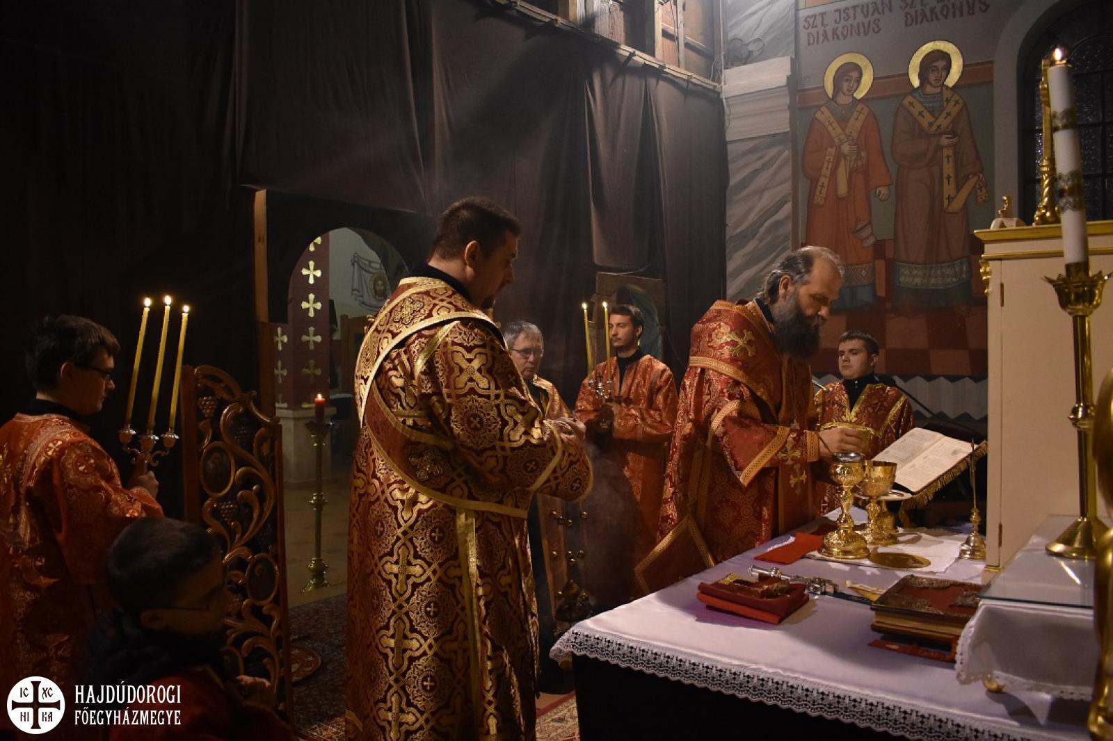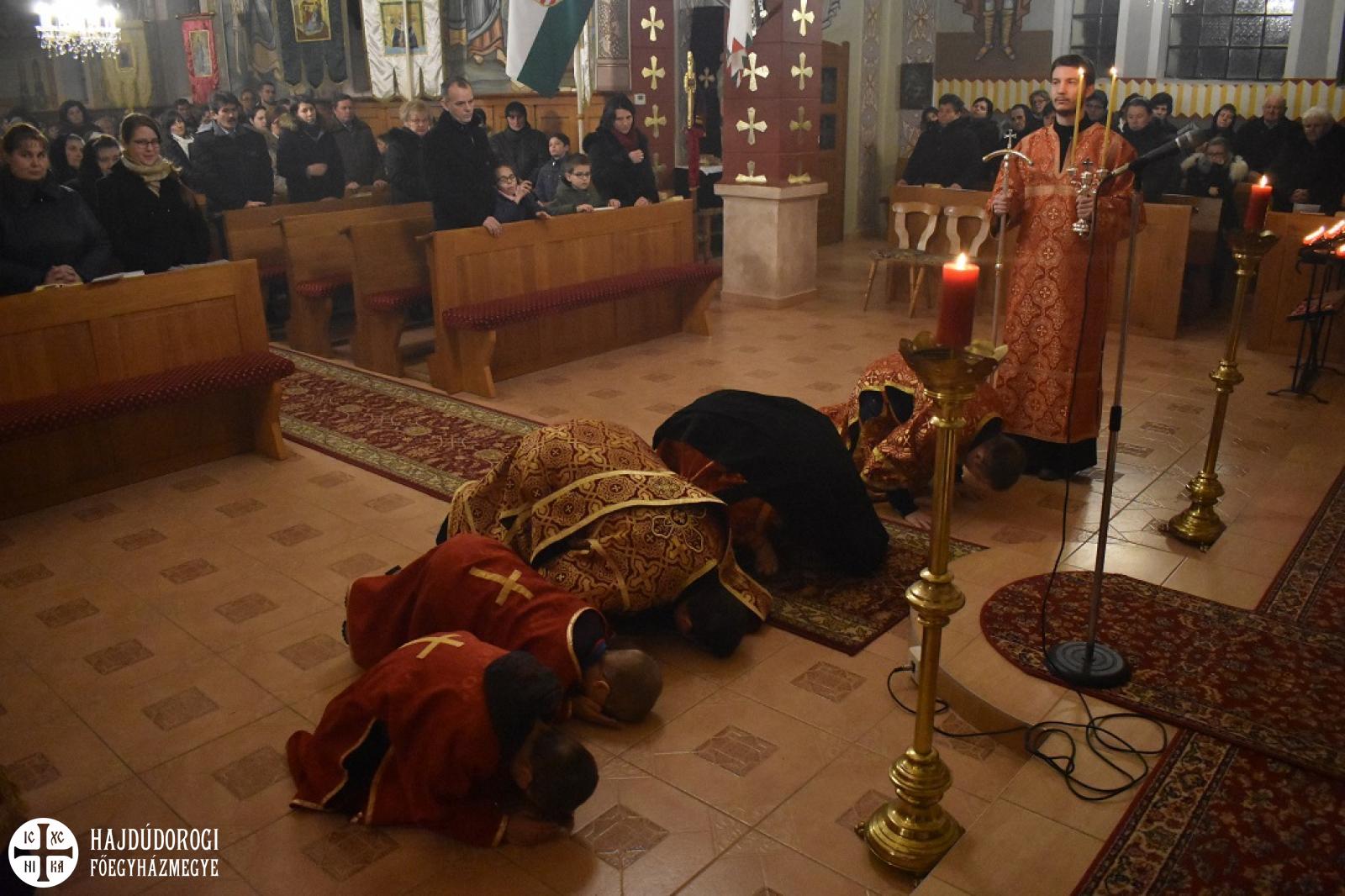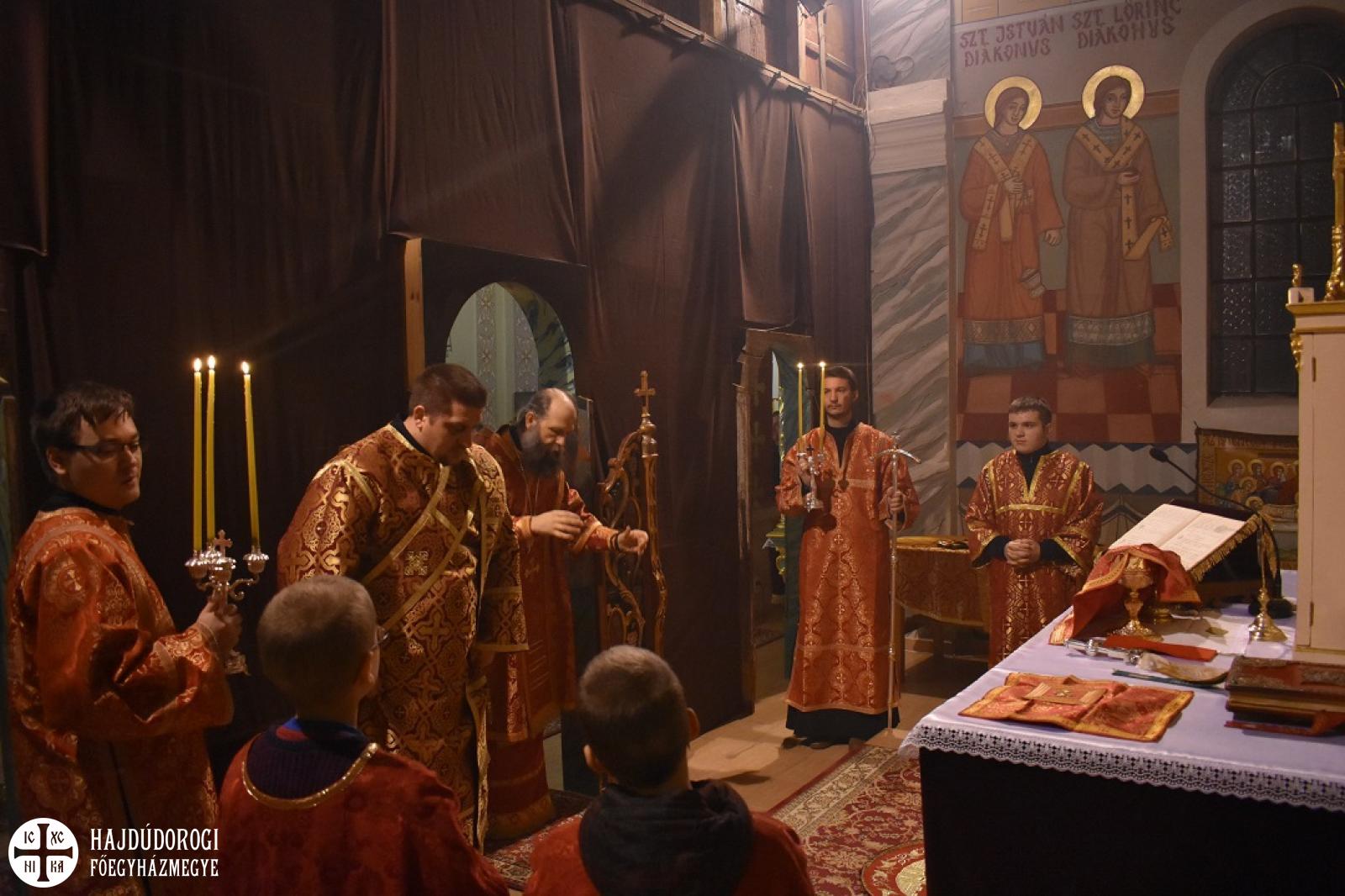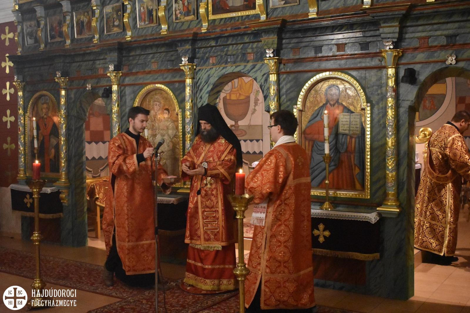 A Nagyböjt egyik kiemelkedő eseménye volt a nyíracsádi egyházközségben, hogy pénteken, február 23-án Kocsis Fülöp metropolita végezte az Előreszentelt Áldozatok Liturgiáját. A templomunkban mintegy kétszázötvenen énekelték a böjt elgondolkoztató imádságait. Az éppen nálunk vendégeskedő kispapok segítették a kántori feladatok elvégzését. A diakónusi szolgálatot Tóth Lóránt látta el, aki nemrégen részesült az egyházi rend alsó fokozatában.
