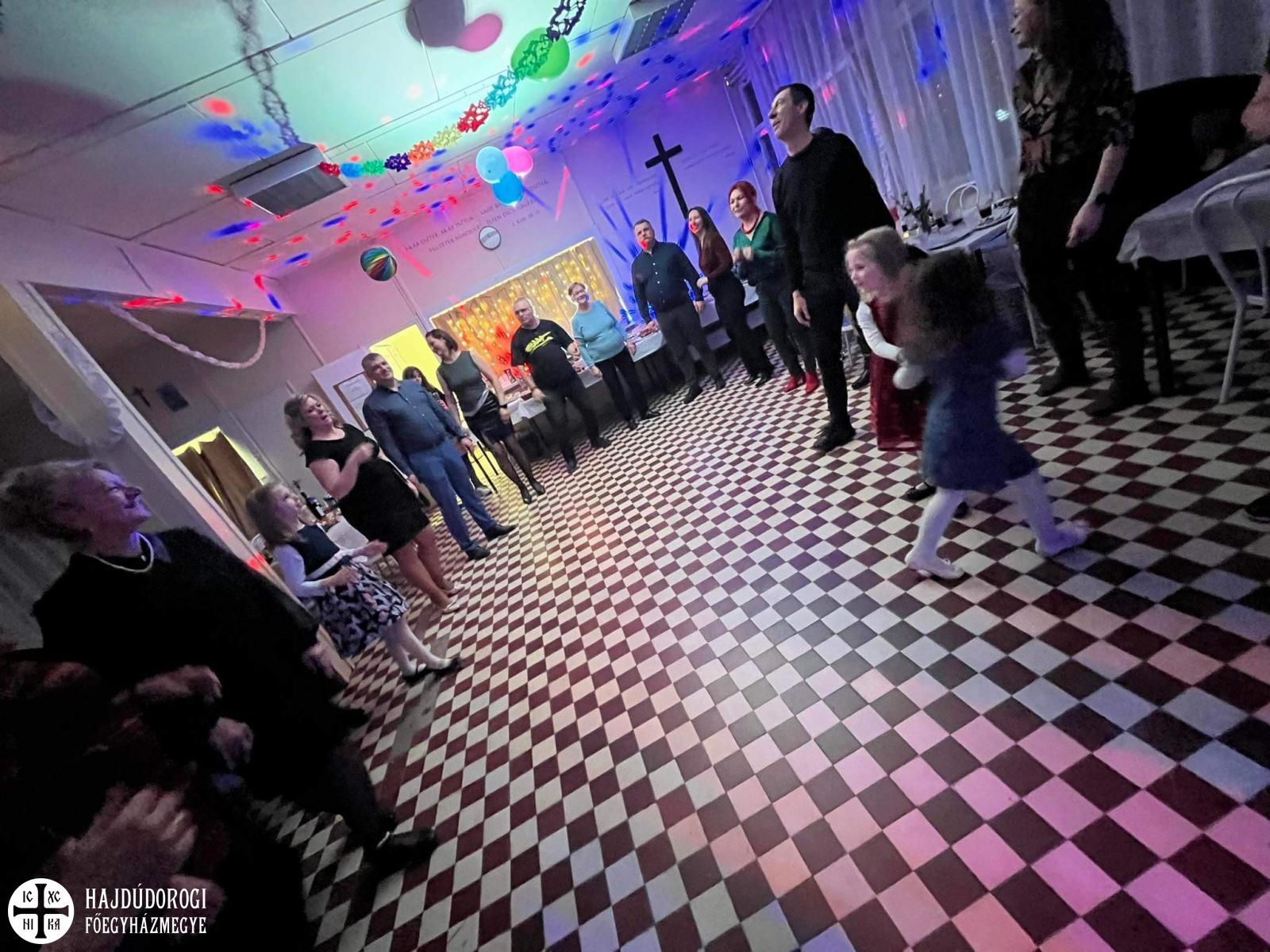 Idén azonban már nemcsak gyermekekre gondoltunk. Így szerveztük meg hagyományteremtő szándékkal egyházközségünk első Felnőtt farsangját, ahol várakozáson felül vettek részt közösségünk tagjai. A farsang a táncról, mulatozásról szólt, közben svédasztal várta a megéhezőket. Az est fénypontjaként megünnepeltük templomunk 75 születésnapját is. A „születésnapi” torta gyertyáit egyik legkisebb, s a legidősebb hívünk fújta el. Természetesen nem maradhatott el a tombola sem, ahol a gyermekek örömmel segédkeztek. Vidám hangulatban alapoztuk meg felnőttek farsangját, s már ezen az estén megfogalmaztuk, hogy jövőre is szervezünk ilyet.