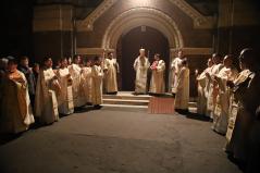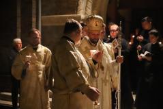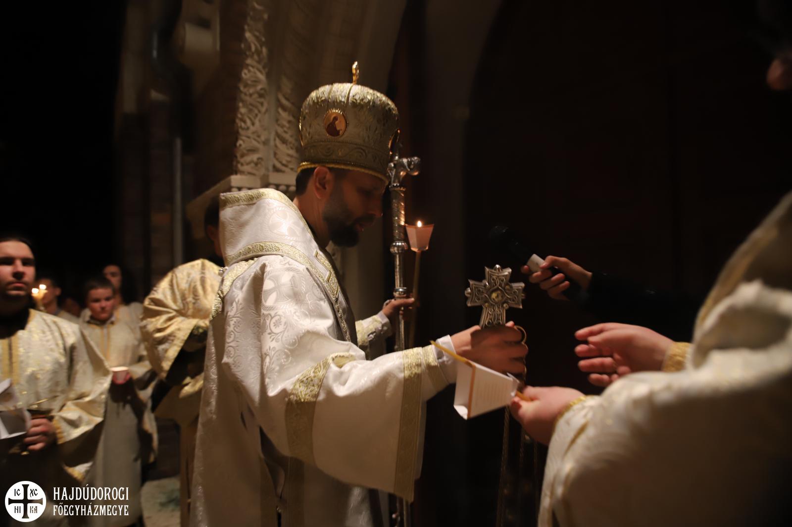 Később, az éjszakai órákban nyitott templomban virrasztottak a hívek az Apostolok Cselekedeteit olvasva, ezzel is mintegy elővételezve, hogy mit hoz, mit eredményez Krisztus föltámadása: új életet, az Egyház életét. A feltámadási szertartásra a papság levetette böjti ruháját és teljes fehér díszbe öltözött ezzel is jelezve, hogy küszöbön áll a feltámadás. A hagyományoknak megfelelően körmenet indult; a hívek meggyújtották gyertyáikat a papok gyertyájáról, így járták körül a templomot, énekelve, imádkozva.