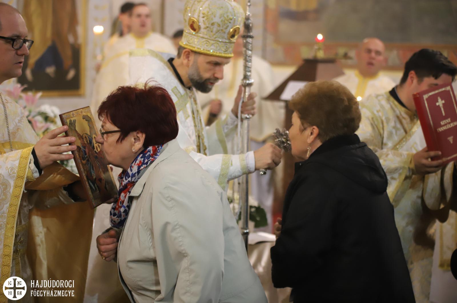 A körmenet ilyenkor a kenethozó asszonyok menetét idézi a Megváltó sírjához. Ezt követően Fülöp metropolita felolvasta a templomajtóban a feltámadásról szóló evangéliumi részeket majd kereszt alakban megkopogtatta az ajtót és belépett a hívekkel.