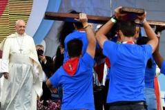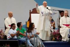Emlékszem, hogy Krakkóban megkérdezték tőlem, ott leszek-e Panamavárosban, én pedig azt feleltem: „Azt nem tudom, hogy én ott leszek-e, de Péter biztosan ott lesz, Péter ott lesz.” Ma örülök, hogy azt mondhatom nektek: Péter veletek van, hogy ünnepelje és megújítsa bennetek a hitet és a reményt. Péter és az Egyház veletek jár, és szeretnénk azt mondani nektek, hogy ne féljetek, hanem haladjatok tovább ezzel a megújító energiával és ezzel az állandó nyughatatlansággal, amely segít és megmozgat bennünket, hogy vidámabbak és készségesebbek, az evangélium jobb tanúi legyünk. Menjetek előre, de ne azért, hogy egy párhuzamos, egy kicsit „szórakoztatóbb” vagy „menőbb” egyházat hozzatok létre egy ifjúsági rendezvényen, néhány díszítő elemmel, mintha ez boldoggá tenne benneteket! Ha valaki ezt gondolná rólatok, az azt jelentené, hogy nem tart tiszteletben benneteket, és nem tartja tiszteletben mindazt, amit a Lélek rajtatok keresztül üzen nekünk.