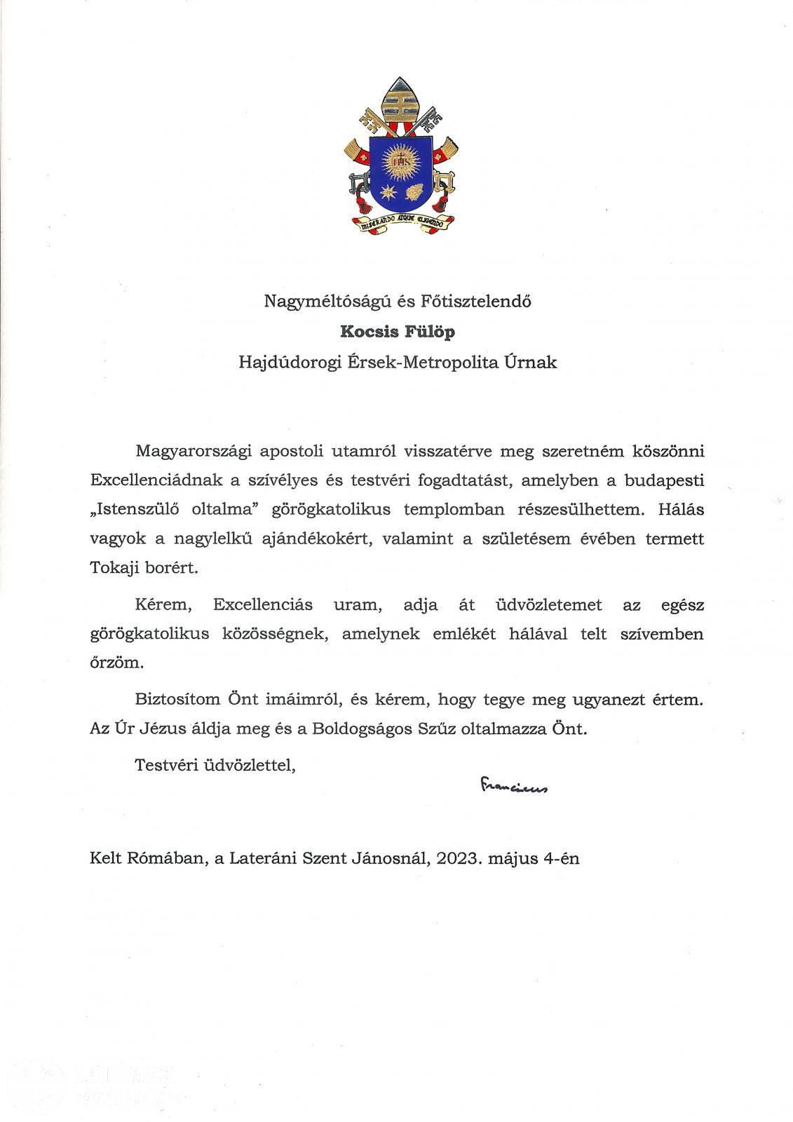 A Szentatya Erdő Péter bíborosnak és Veres Andrásnak, a Magyar Katolikus Püspöki Konferencia elnökének is levélben fejezte ki köszönetét a fogadtatásért és látogatásának lebonyolításáért.