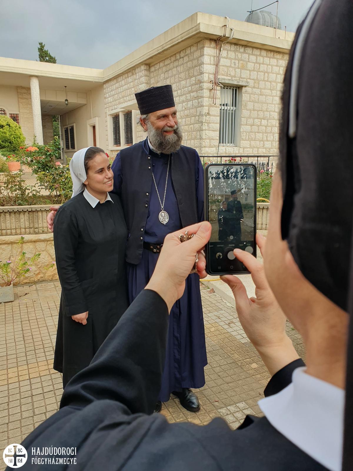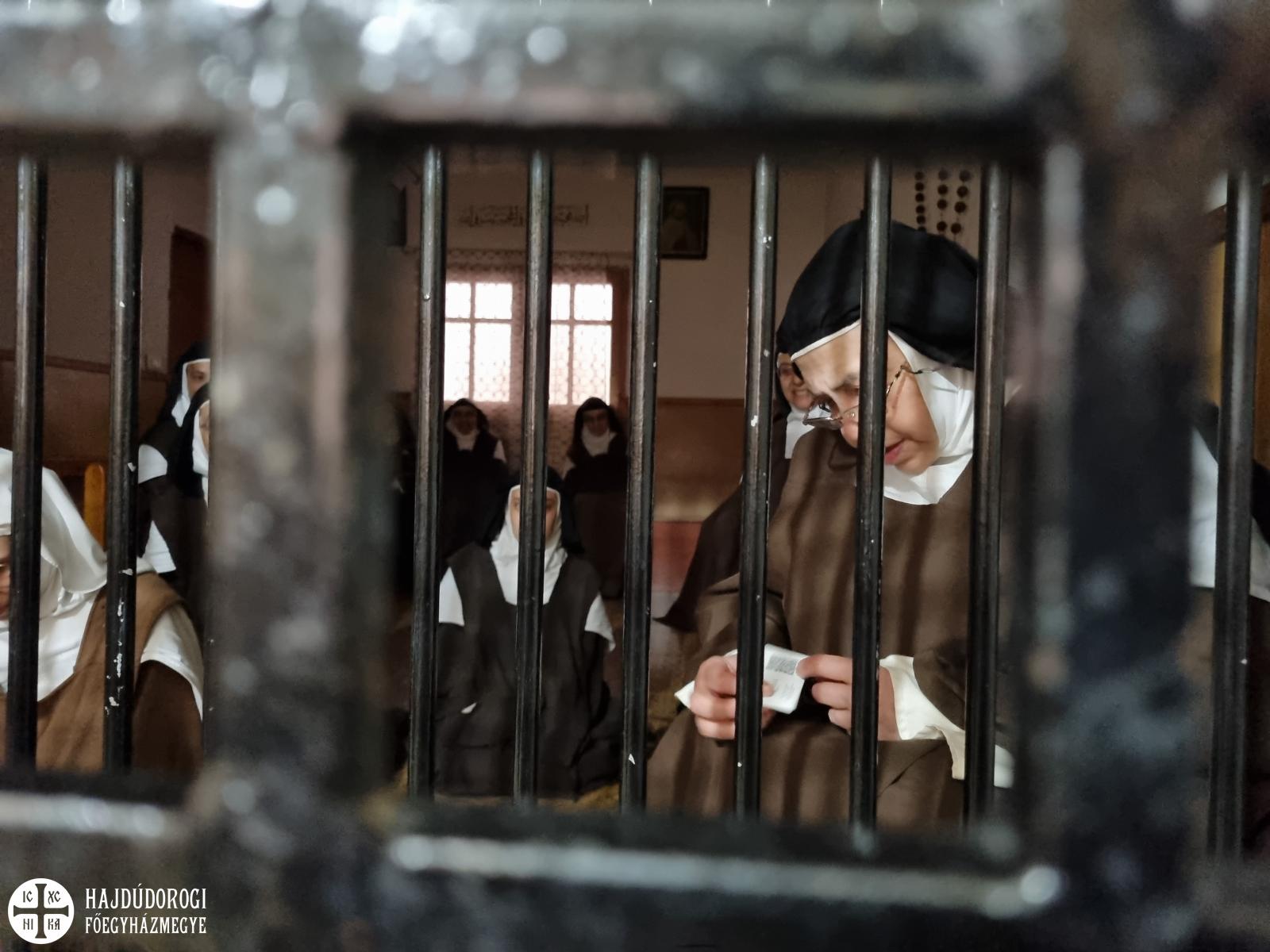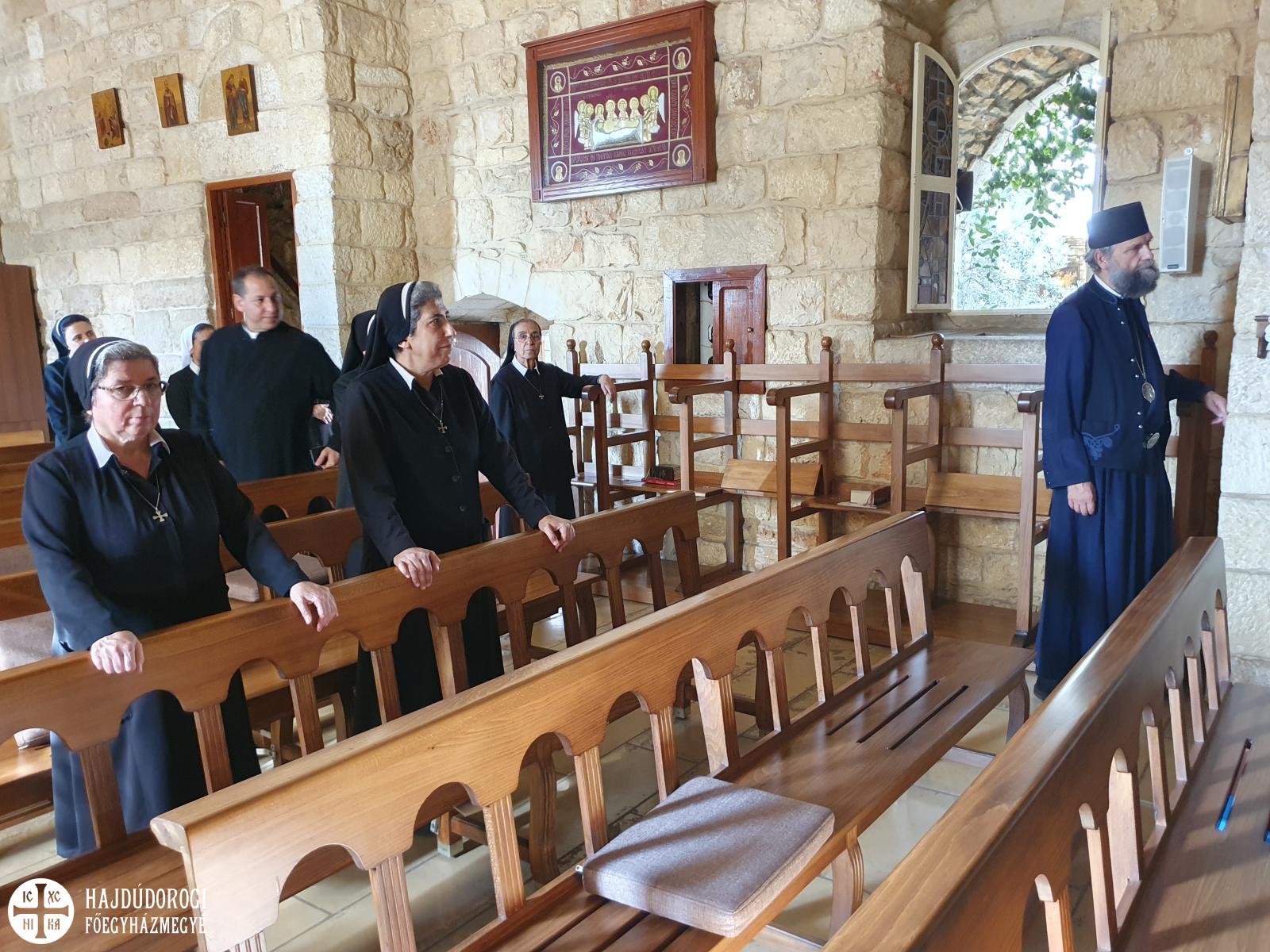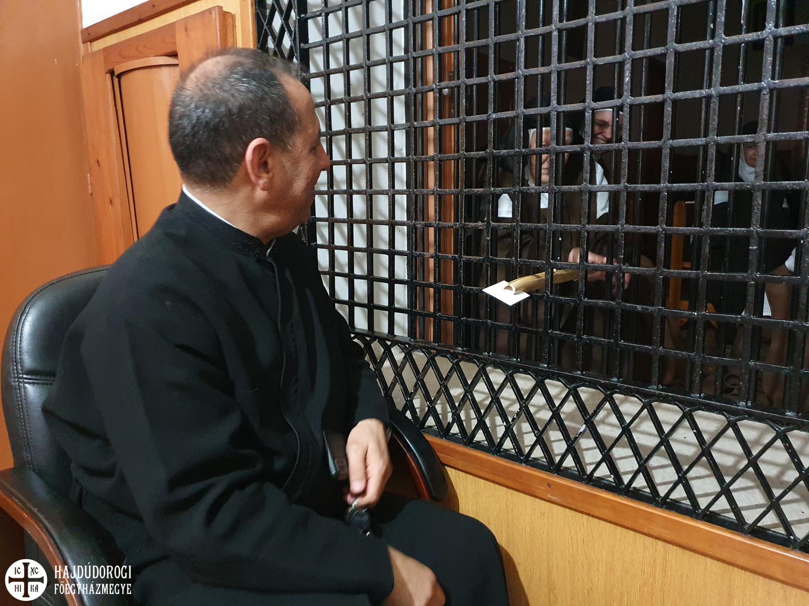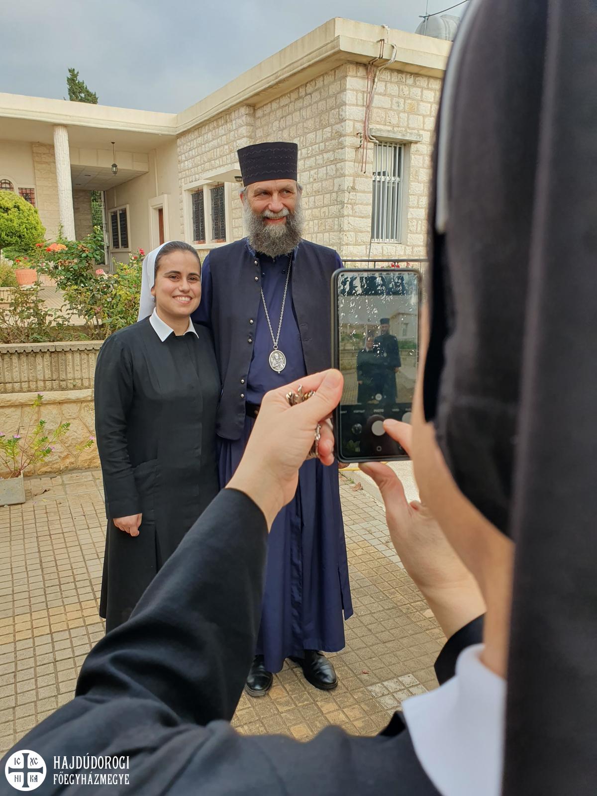 Vendéglátónk és sofőrünk, Naim atya közölte a nővérrel, hogy Fülöp atya, a magyar görögkatolikus metropolita jött látogatóba. Hamarosan egy kulcsot forgatott ki a nővér, mely a szomszédos szoba ajtaját nyitotta. Ez volt a látogatószoba, ahol ikonok, székek, a falon pedig egy duplafalú rács volt, melynek túloldala egy fa tolóajtóval is el volt zárva. Ez volt a nővérek ablaka a külvilágra. Hamarosan halk neszezés, pusmogás hallatszott a túloldalról, és egyszer csak elhúzódott a tolóajtó. Húsz, tetőtől talpig fedett nővér mosolygott ránk a dupla rácsfal mögül. Két oldalt ültek, elöl az idősebbek, hátul a fiatalabbak, középen, térdelve az első fogadalmasok, legelöl a novícia.