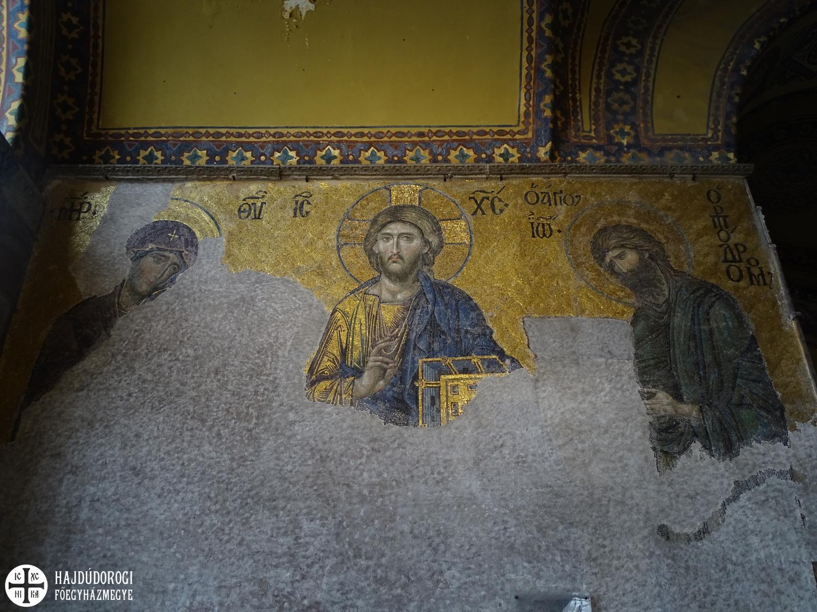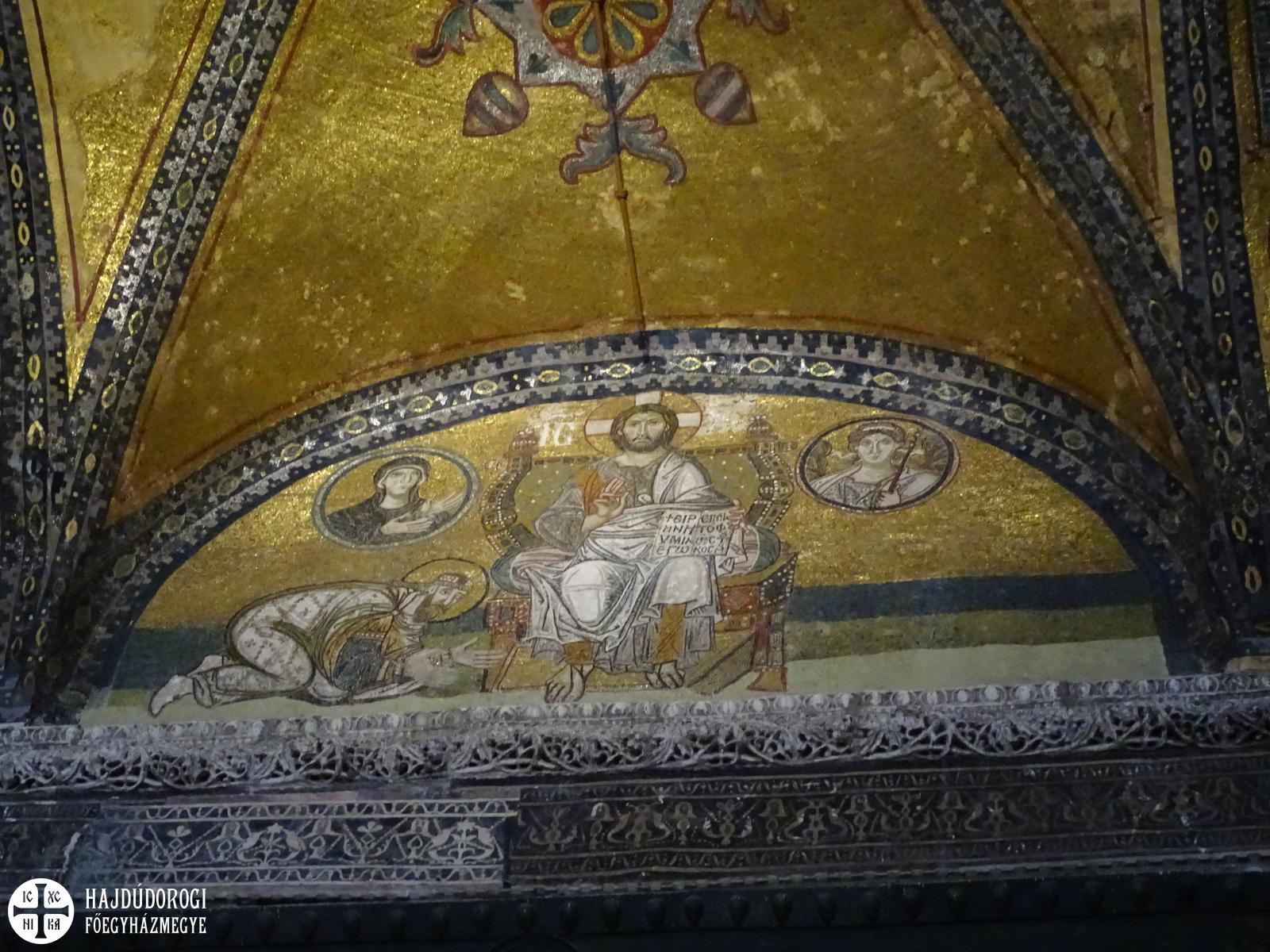 A hatalmas templom egykoron volt csodálatos, arany mozaikkal fedett mennyezetéről és falaiból csak töredékek maradtak meg (mely még így is hatalmas felületeket jelent), mert a város ottománok általi elfoglalása után a templomra félholdat tűztek, keresztény jelképeit kivésték a kövekből, lefestették, lemeszelték, s az épületet mecsetként használták. A szentély fölötti hatalmas Istenszülő és a mellette álló angyal megmenekült, akárcsak Krisztus mozaikjai, őket ugyanis a muzulmánok is prófétaként tisztelik, de Aranyszájú Szent János pátriárka mozaikja is látszik a templomban. Még az őrökkel történt atrocitás előtt a szentélynél az Istenszülőt is magyar görögkatolikus énekkel köszöntöttük, a Valóban méltó… és az Üdvözlégy Istenszülő Szűz halk eléneklése olyan lelki élményt jelentett, hogy azt soha nem fogjuk elfeledni.