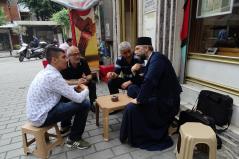 Galata városrészben egy szűk, nem éppen szép sikátor leharcolt sufnijában török kávézót véltünk fölfedezni, ezt pedig ki kellet próbálni Isztambulban. Az előtte üldögélő borostás öregek ezt látva azonnal hellyel kínáltak bennünket, leültettek kis asztalukhoz, néhány újabb öreg érkezése után pedig barátságos beszélgetésbe elegyedtünk velük az itteni életről, az iszlámról, kereszténységről, Magyarországról, Puskásról. Mint kiderült, kurdok voltak és nagyon nagyra értékelték, hogy az Iszlám Állam által meggyalázott keresztényeknek viszünk adományt. A sűrű török kávét természetesen nem engedték kifizetni, és baráti kézfogások közepette búcsúztak el tőlünk. Megható ez a balkáni vendégszeretet.