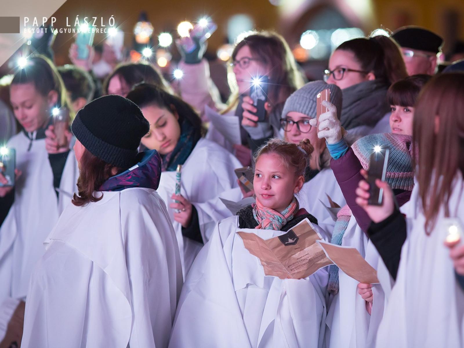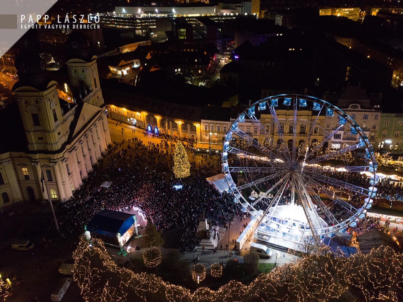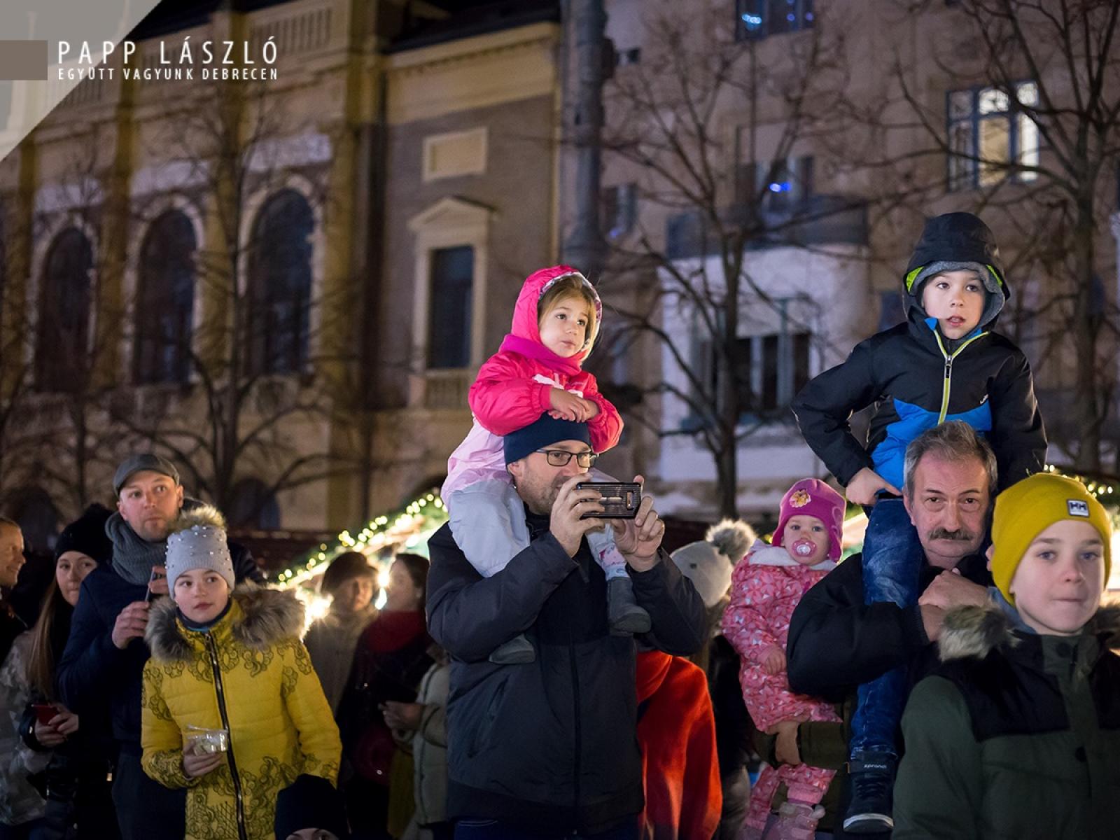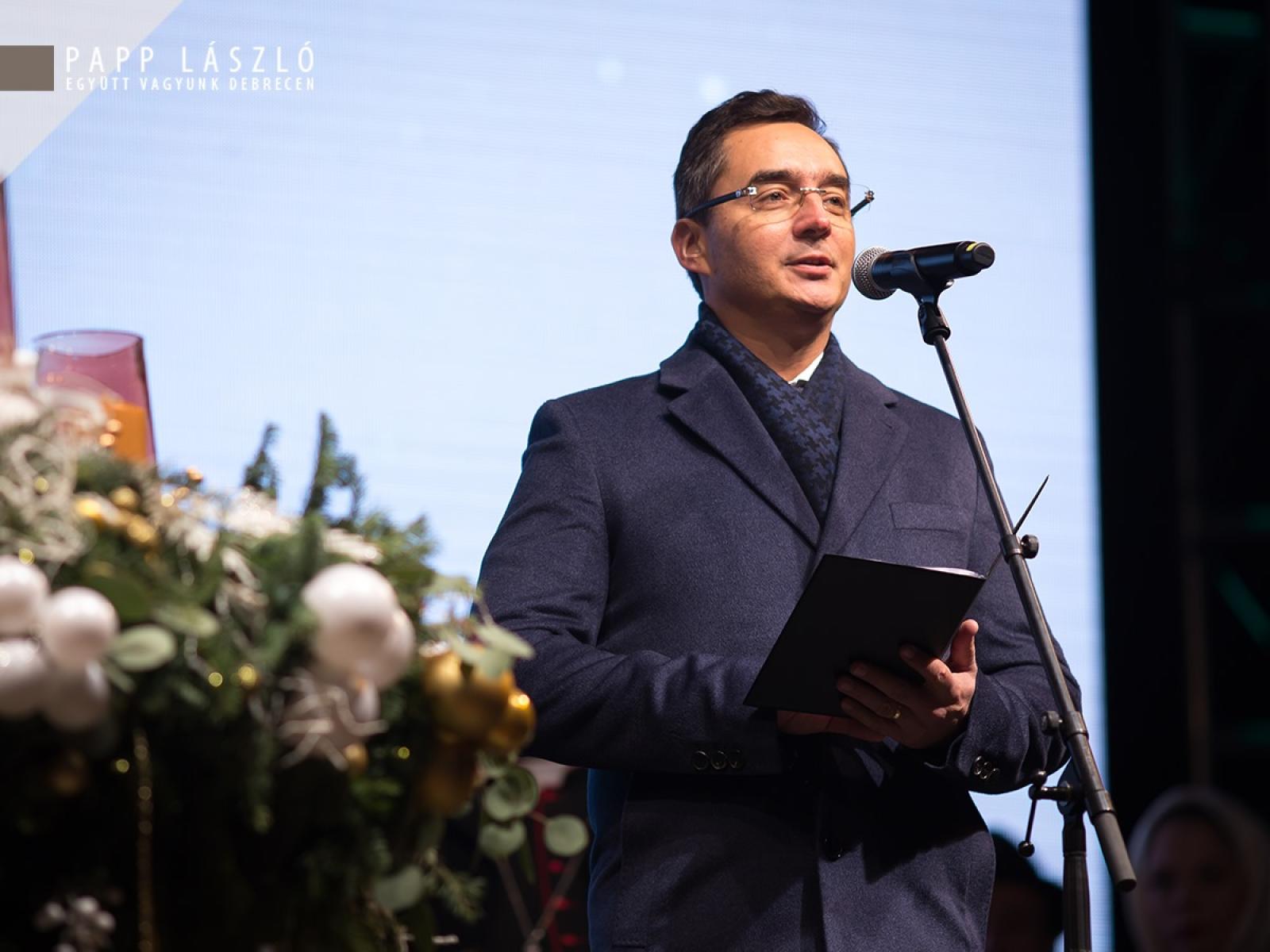 Papp László polgármester is megosztotta a jelenlévőkkel ünnepi gondolatait: „A modern kori karácsony gyönyörű, és egyben elképesztő látványosságban nyilvánul meg. Nem egyszer láthatjuk, hogy a karácsony világi jelképei, már talán semmilyen kapcsolatban nem állnak a keresztény tanításokkal: a hittel, Jézus születésével – ha le akarom egyszerűsíteni – akkor pusztán egy nagy bevétellel kecsegtető ünnep, amelyhez meg kell teremteni a fogyasztásra, a költekezésre ösztönző látványvilágot. Ha magunkba nézünk, akkor pontosan tudjuk, mi sem tudunk ellenállni a mai, karácsonyhoz kötődő szokásoknak. Amelyeknek természetesen nagyon fontos része, hogy örömet szerezzünk mindazoknak, akik fontosak számukra, de ez a látványvilág – amelyről beszéltem – a karácsonynak a külsőleg érzékelhető, látható oldala. Ha ez a látható karácsonyi világ – amely körülvesz bennünket – tiszteletben tartja: a tradíciókat, a vallási szokásokat – tiszteli, sőt kiemeli a karácsony keresztény lényegét. Debrecenben, az ünnepre történő felkészülés összeforrt az egyházakkal, a karácsony egyházi, vallási tanításaival, ez pedig segíteni tudja azt a törekvést, hogy minél több emberhez eljusson a karácsony csodálatos üzenete: Jézus születésének öröme.” – hangsúlyozta beszédében.