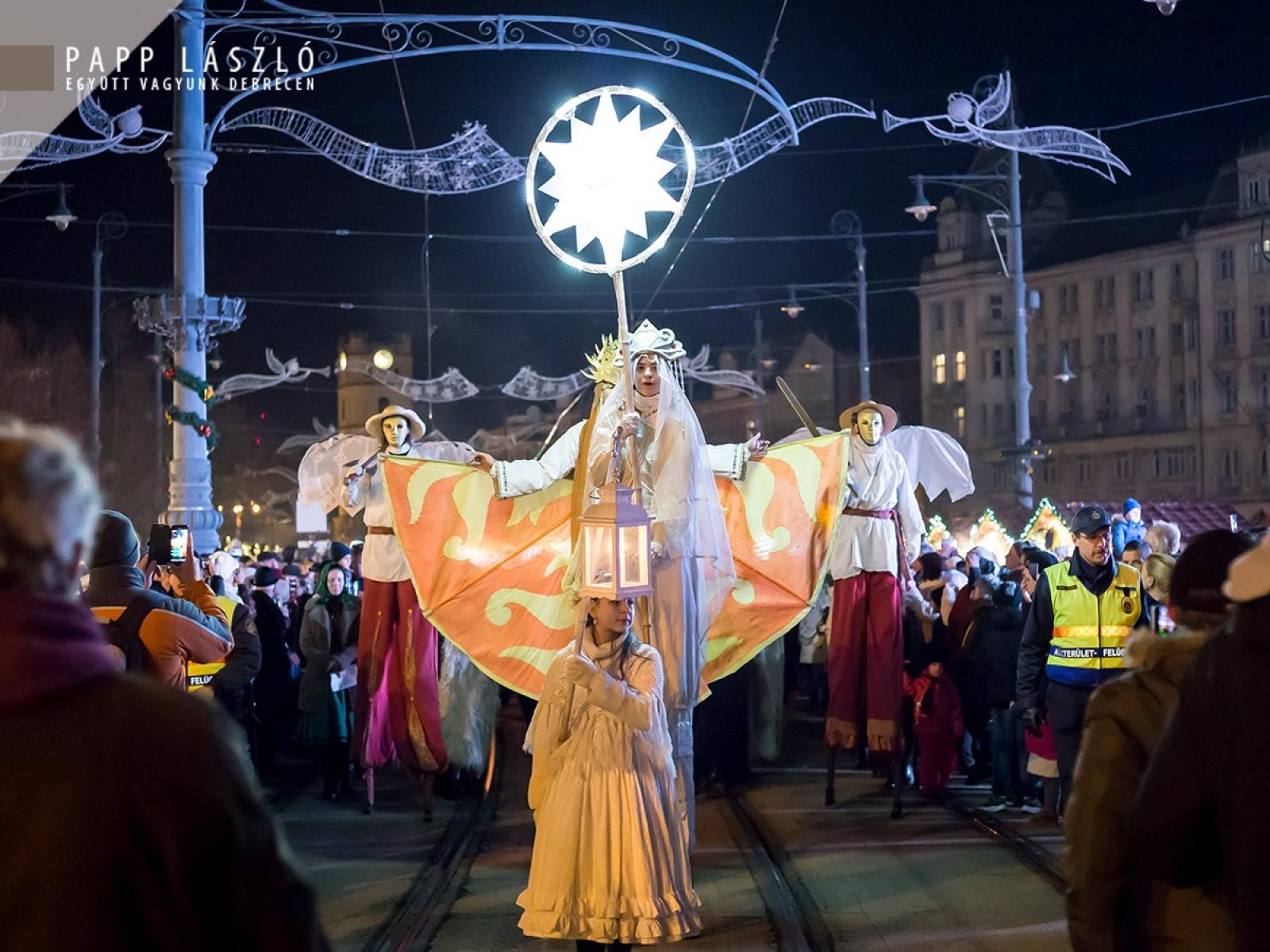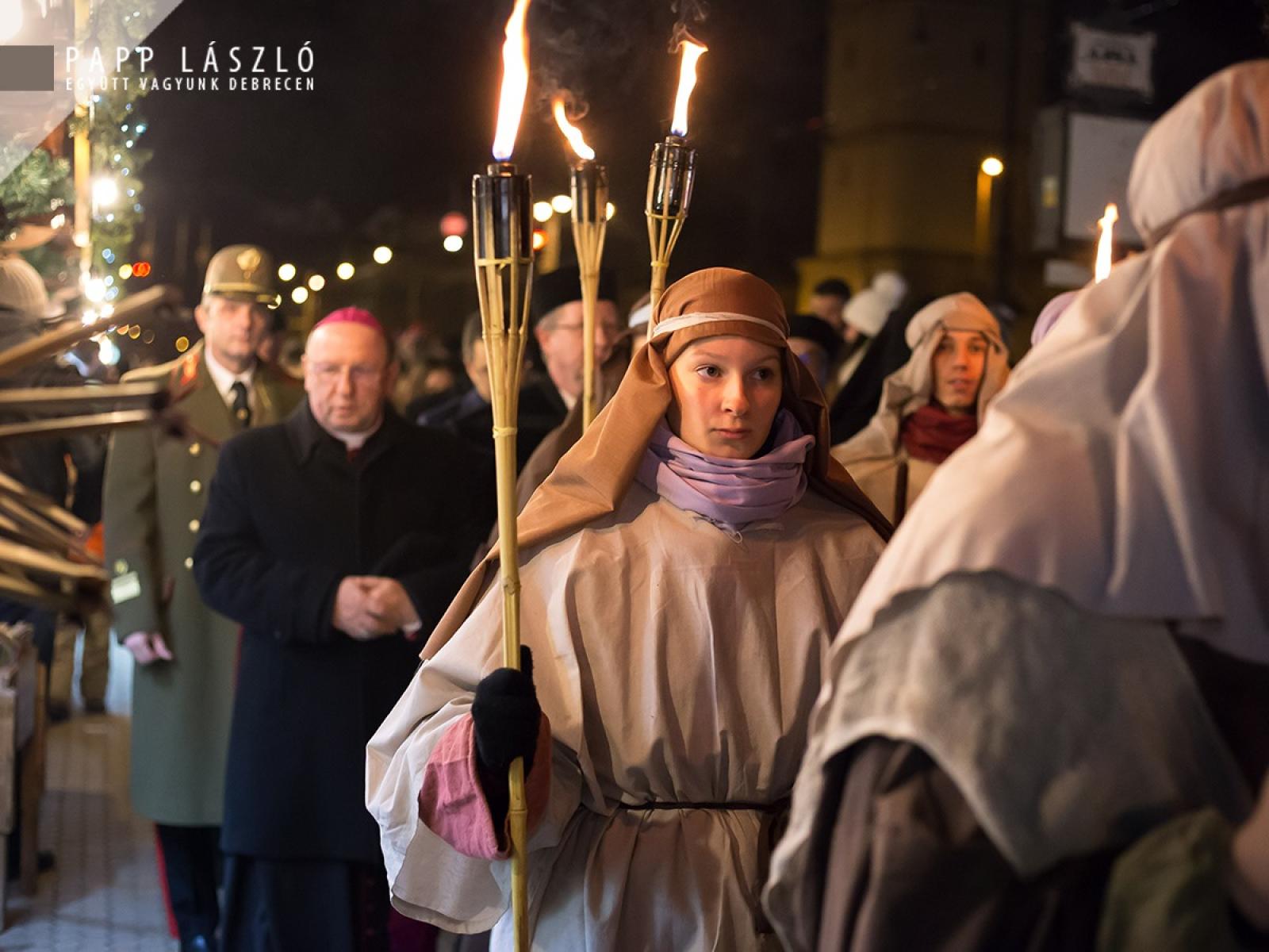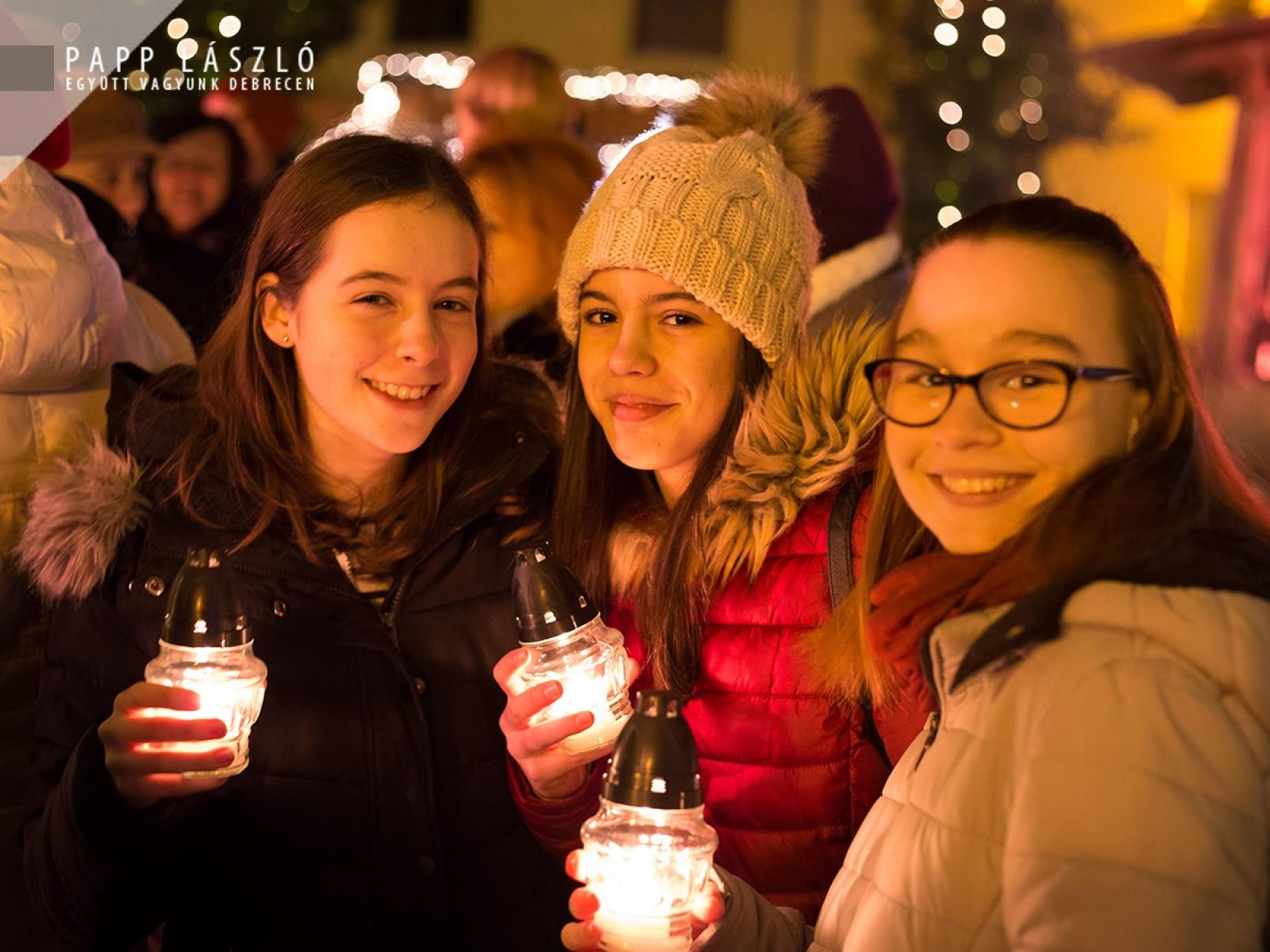 Hercz Nelli, a Debreceni Népi Együttes tagja hozta el a fényt a Kossuth térre, a Nagytemplom előtt több százak vágya teljesült, amikor az adventi koszorún fellobbant az első gyertya lángja vasárnap. Az adventi fényt többen kísérték útján az egyházi felekezetek képviselőivel a Kossuth térig a Régi Városházától indulva – így őrizték együtt a tüzet. A háromkirályok, gólyalábasok vezették az ünnepélyes menetet, őket követte többek között a Debreceni Egyetem Hortobágy Néptáncegyüttese, valamint további fellépők és közreműködők.