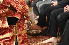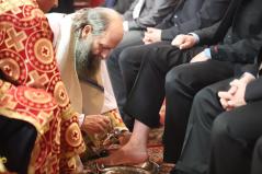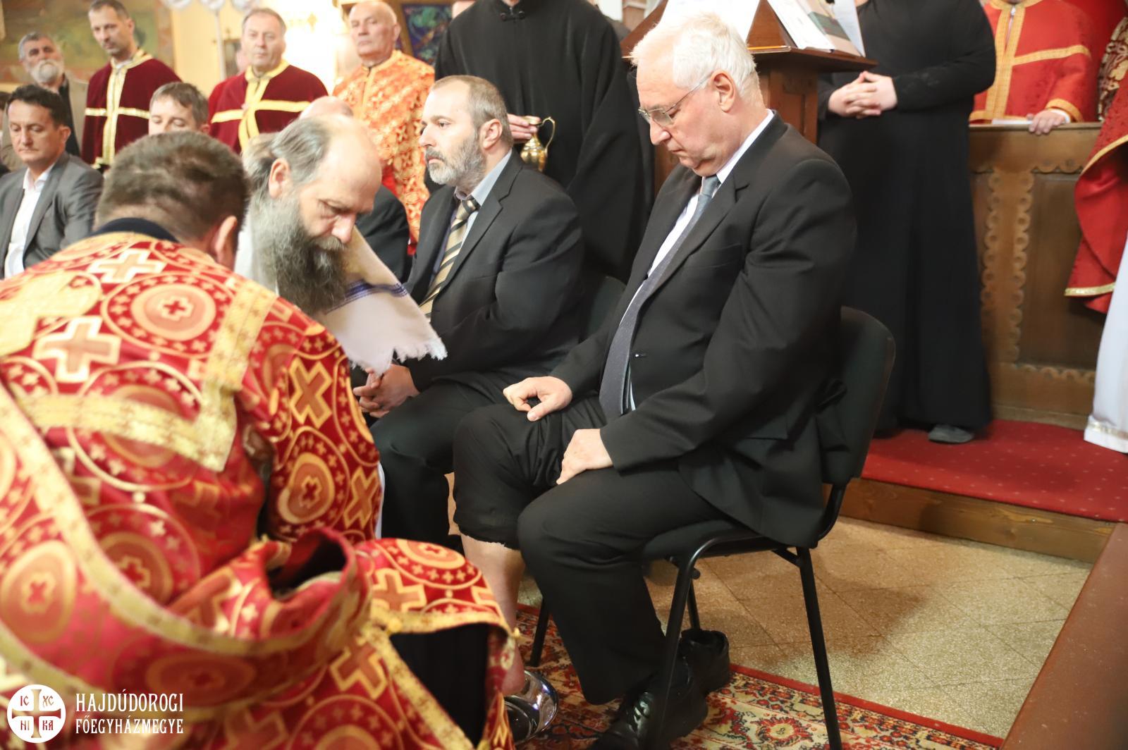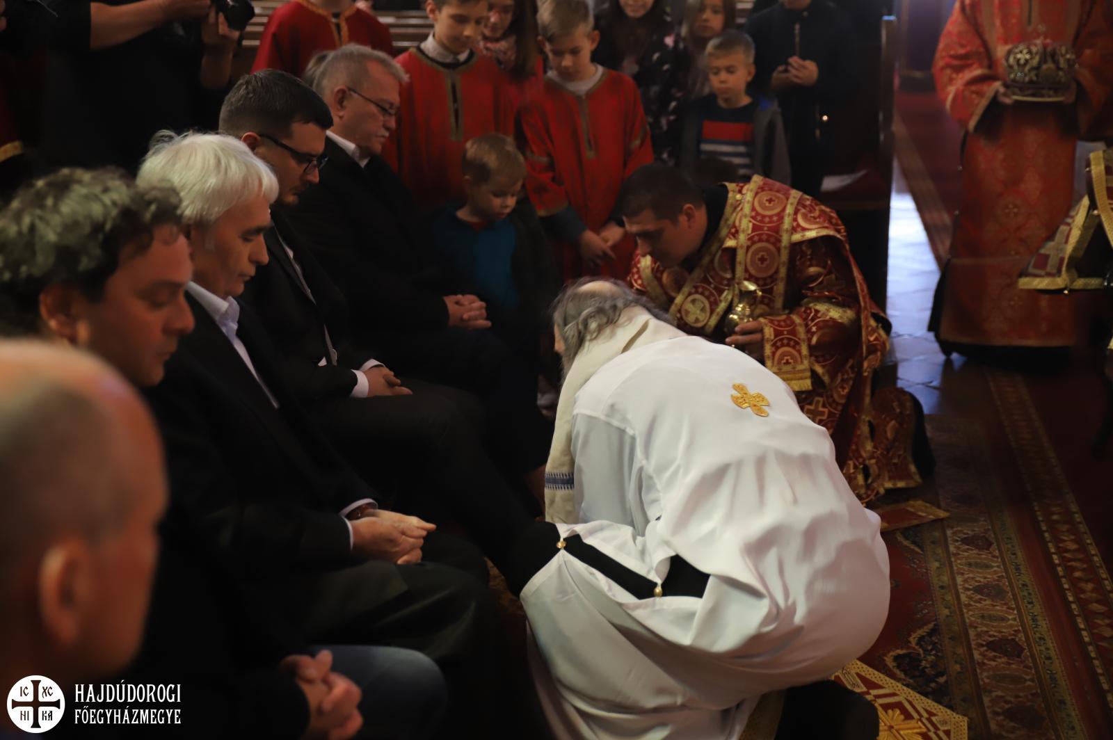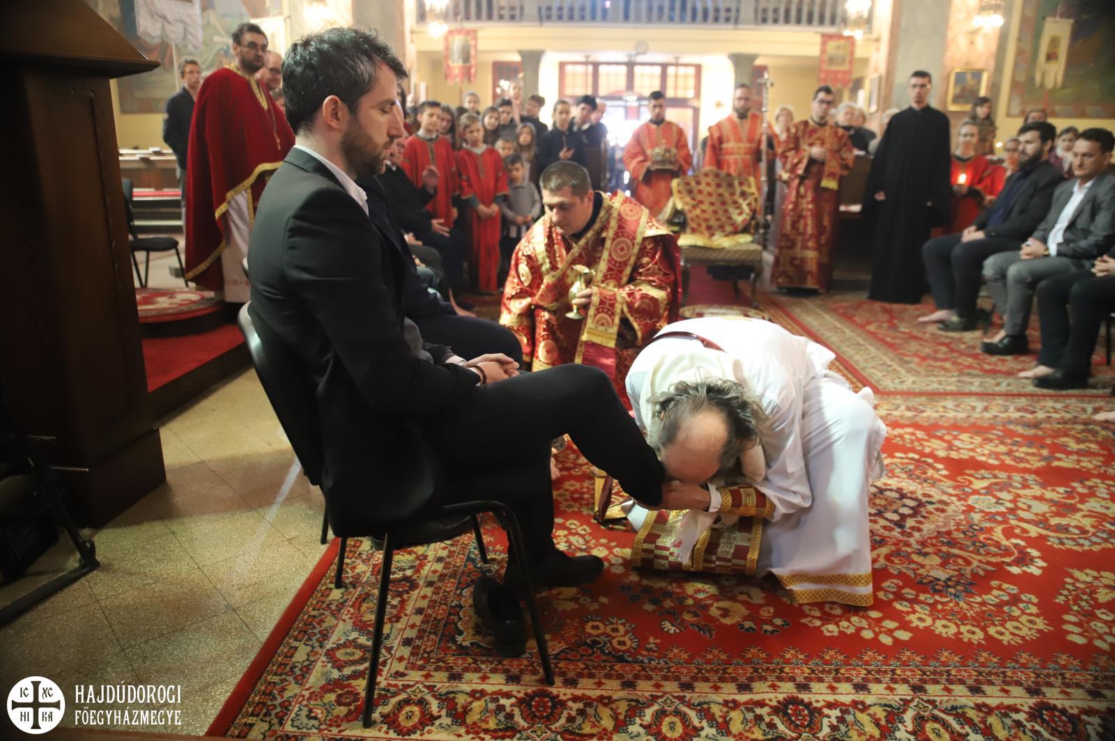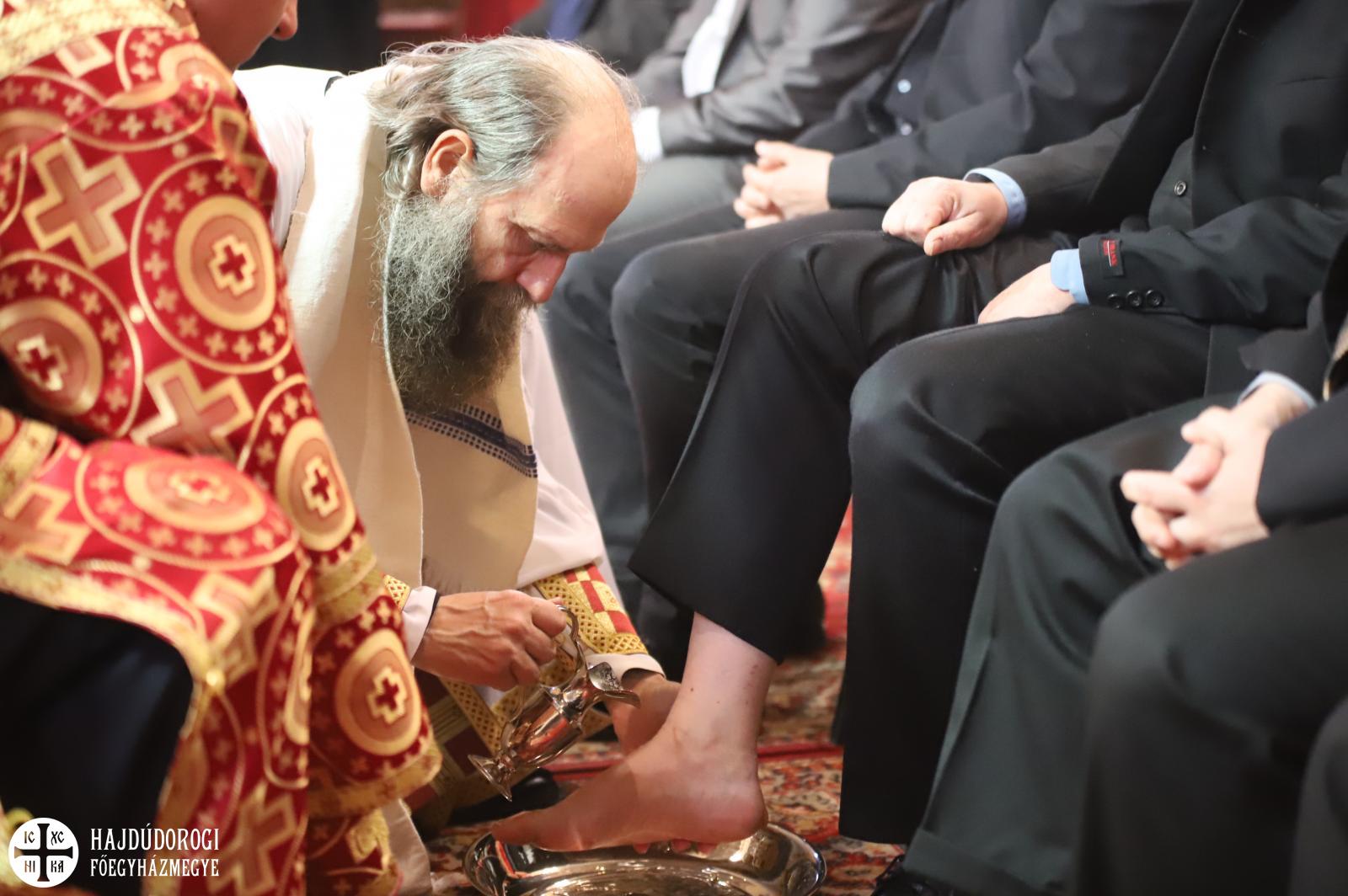 A szertartás végére a szentély előtti térben a paptestvérek és szolgálattevők helyét civil emberek vették át. Ekkor kezdődött el a lábmosás szertartása, ami felidézte Jézus cselekedetét, miként mosta meg tanítványainak a lábát. Majd tanítást is adott: nekünk is meg kell mosnunk egymás lábát, azaz egymást kell szolgálnunk. Miközben a fődiakónus Nyirán János olvasta az erről szóló Evangéliumot, Fülöp metropolita az abban hallottakat jelenítette meg: Krisztust utánozva levetette felső ruháját, derekára kendőt terített, kezébe kancsót vett és sorra letérdelt az emberek elé, megmosta és megcsókolta lábukat. A kiválasztott tizenkét férfi között voltak egyetemi tanárok, zenészek, vállalkozók, de egyszerű kétkezi munkások is.