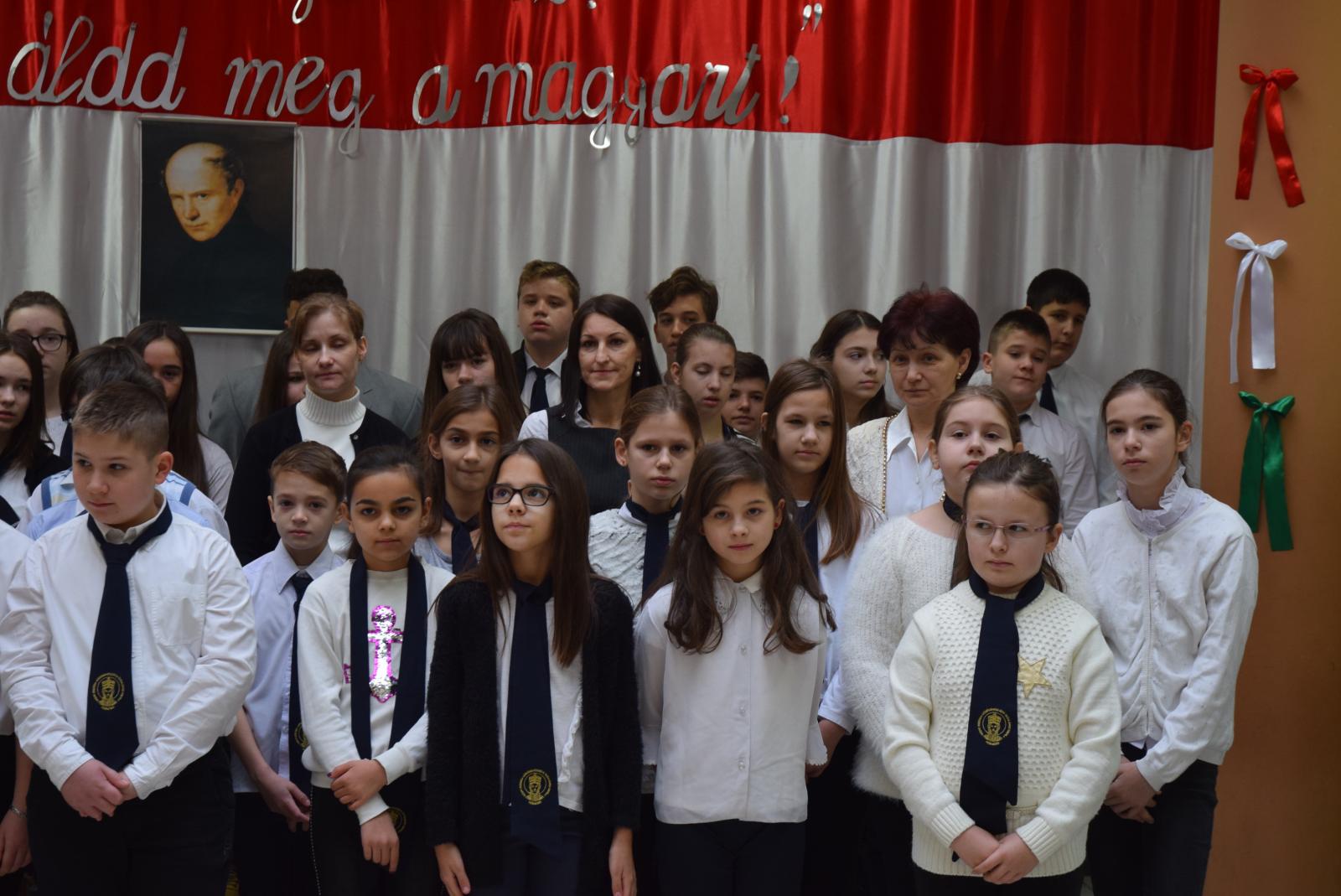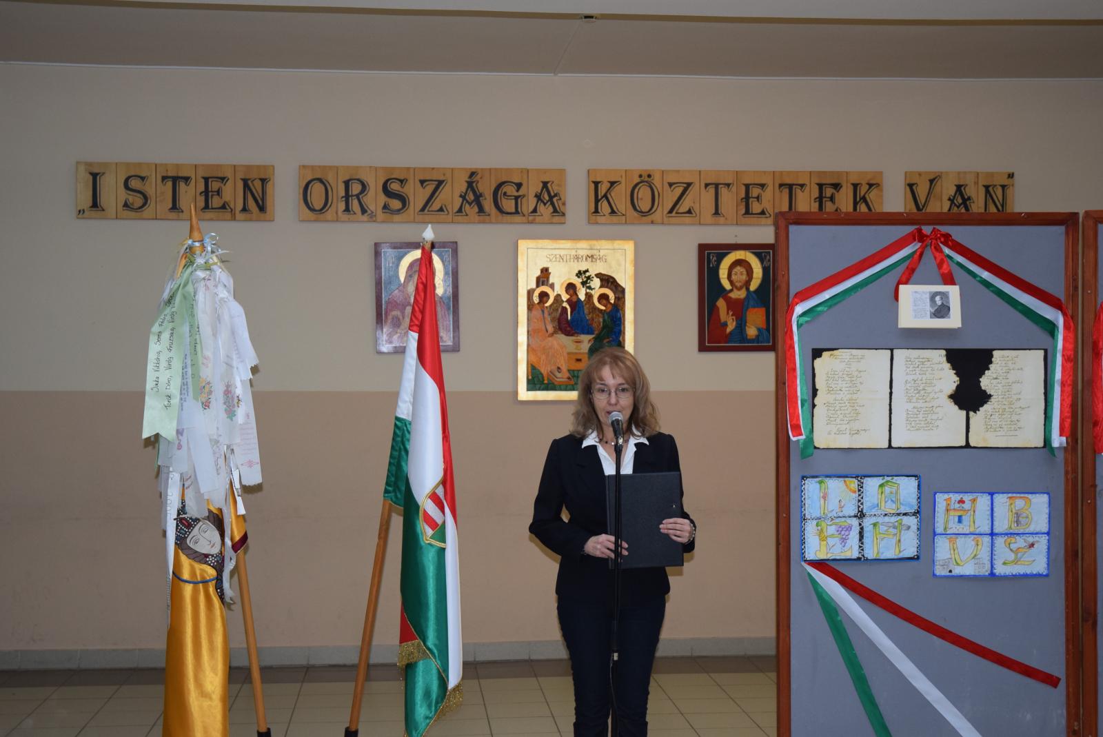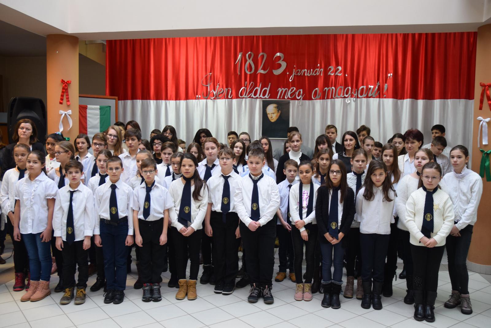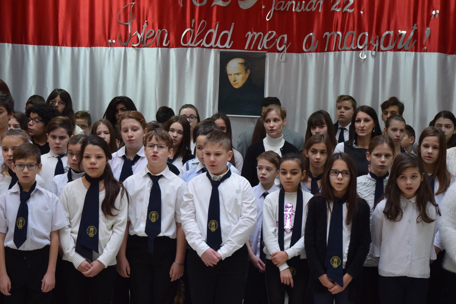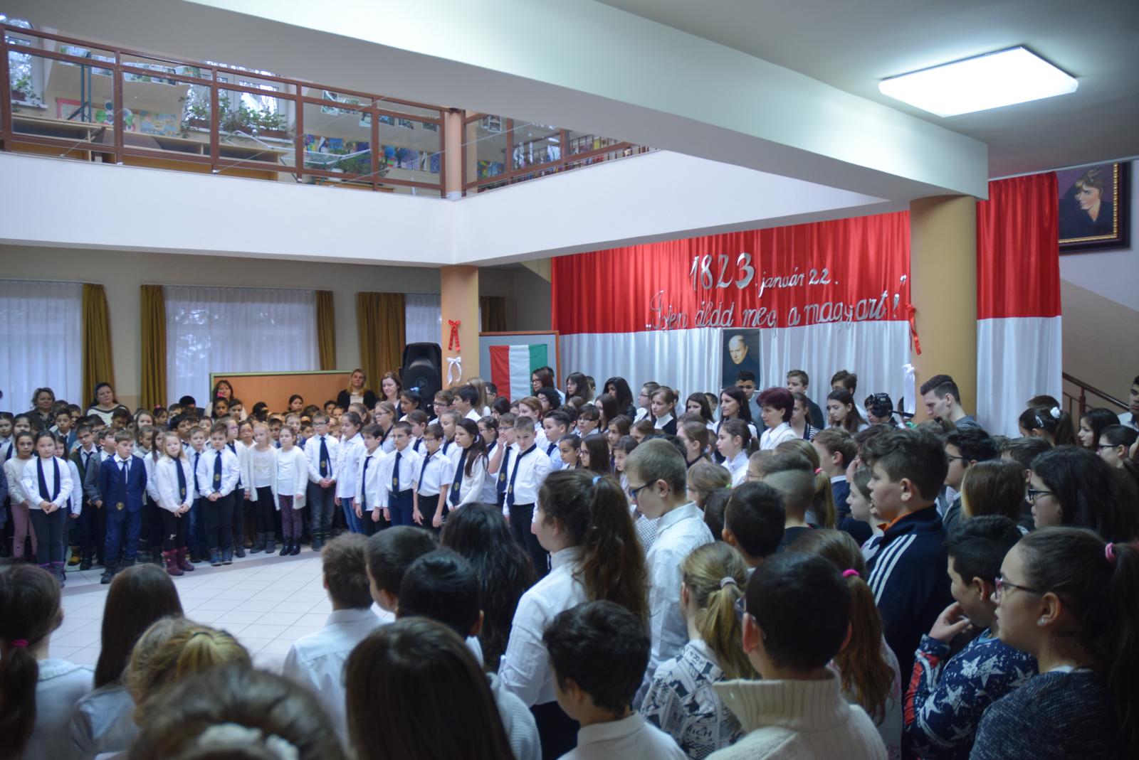 A hagyomány nemzeti imádságunk megírásának 190. évfordulóján indult, így idén már hetedik alkalommal sorakoztak fel a diákok és tanárok az iskola aulájában. A bevezető gondolatok többek között arra irányították rá a gyerekek figyelmét, hogy miként fejezhetjük ki a közös versmondással nemzeti összetartozásunkat, és igaz magyarságunkat.
