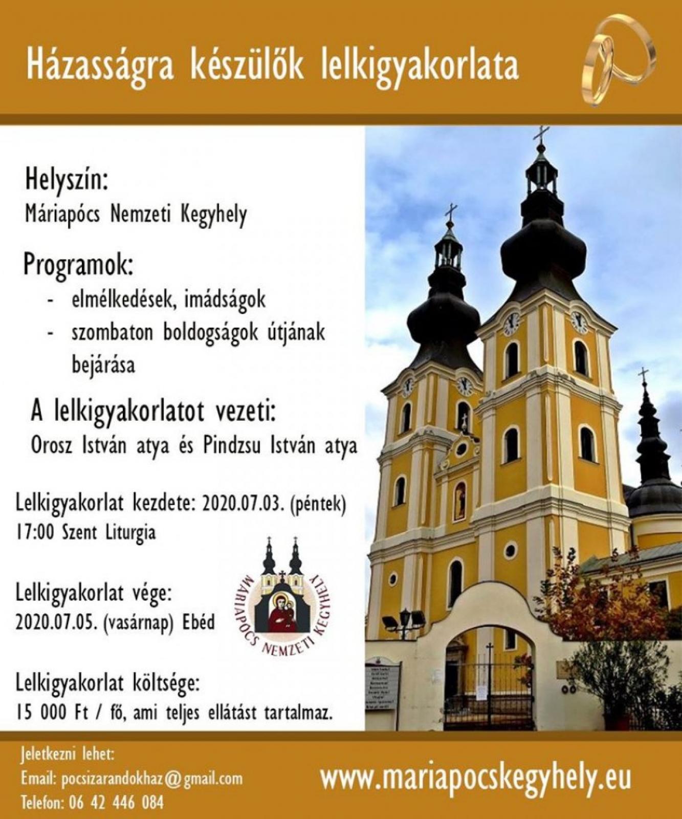 Orosz István kegyhelyigazgató atya és Pindzsu István atya, a Családvár Zarándokház igazgatója lelkigyakorlatot hirdetnek házasságra készülő párok számára. A július 3-án, pénteken délután kezdődő lelkigyakorlat vasárnap délben közös ebéddel ér véget. Részletek a plakáton.