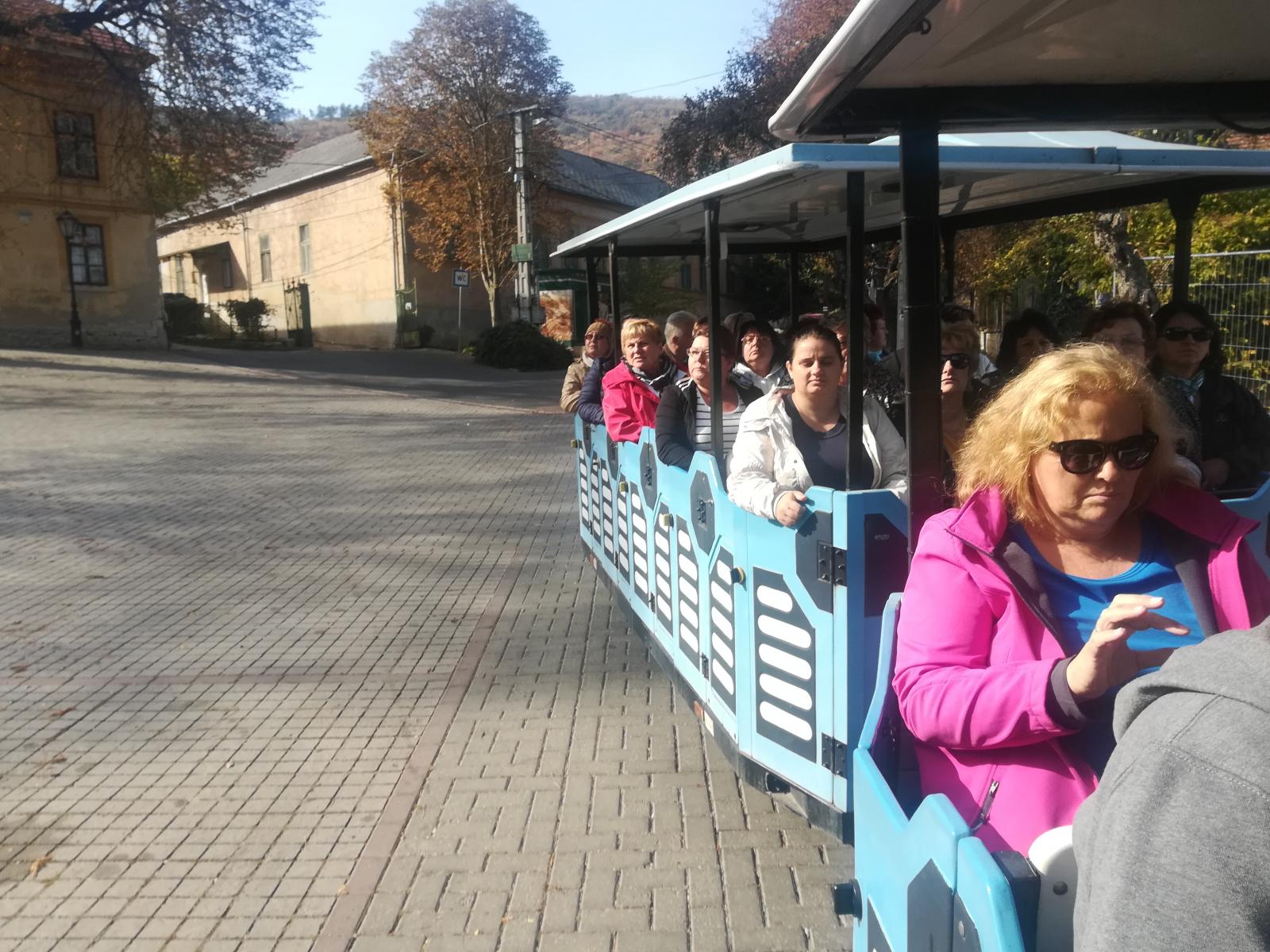 A kellemes ringatózás után a városnéző kisvonatra pattantunk fel, mely körbevitt minket a hangulatos kis utcákon, elkalauzolt a borpincékhez, megmutatta Tokaj nevezetességeit és a város történetéről is sok érdekes információval szolgált. Ennyi élmény és a friss a levegő meghozta az étvágyunkat, melyet a Halra bor nevű étteremben csillapítottunk. Teli hassal sétáltunk vissza a ragyogó napsütésben a buszhoz, hogy utunkat Tarcal fele folytassuk.