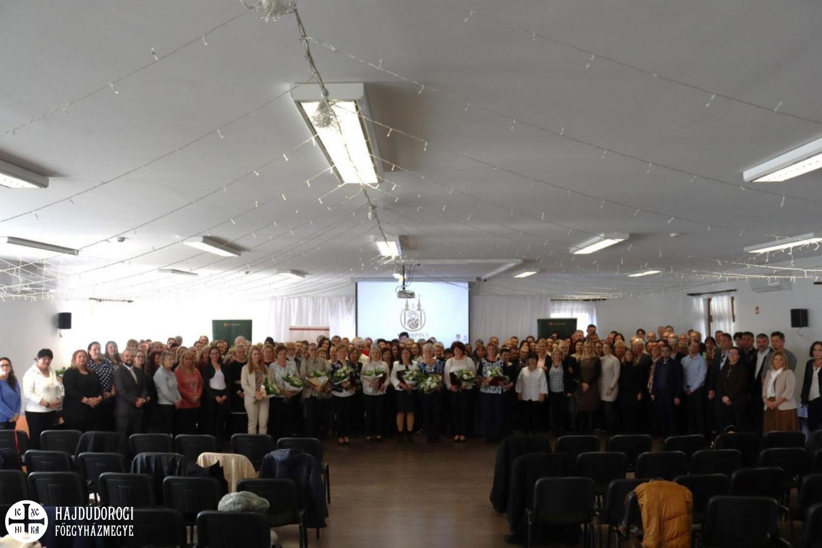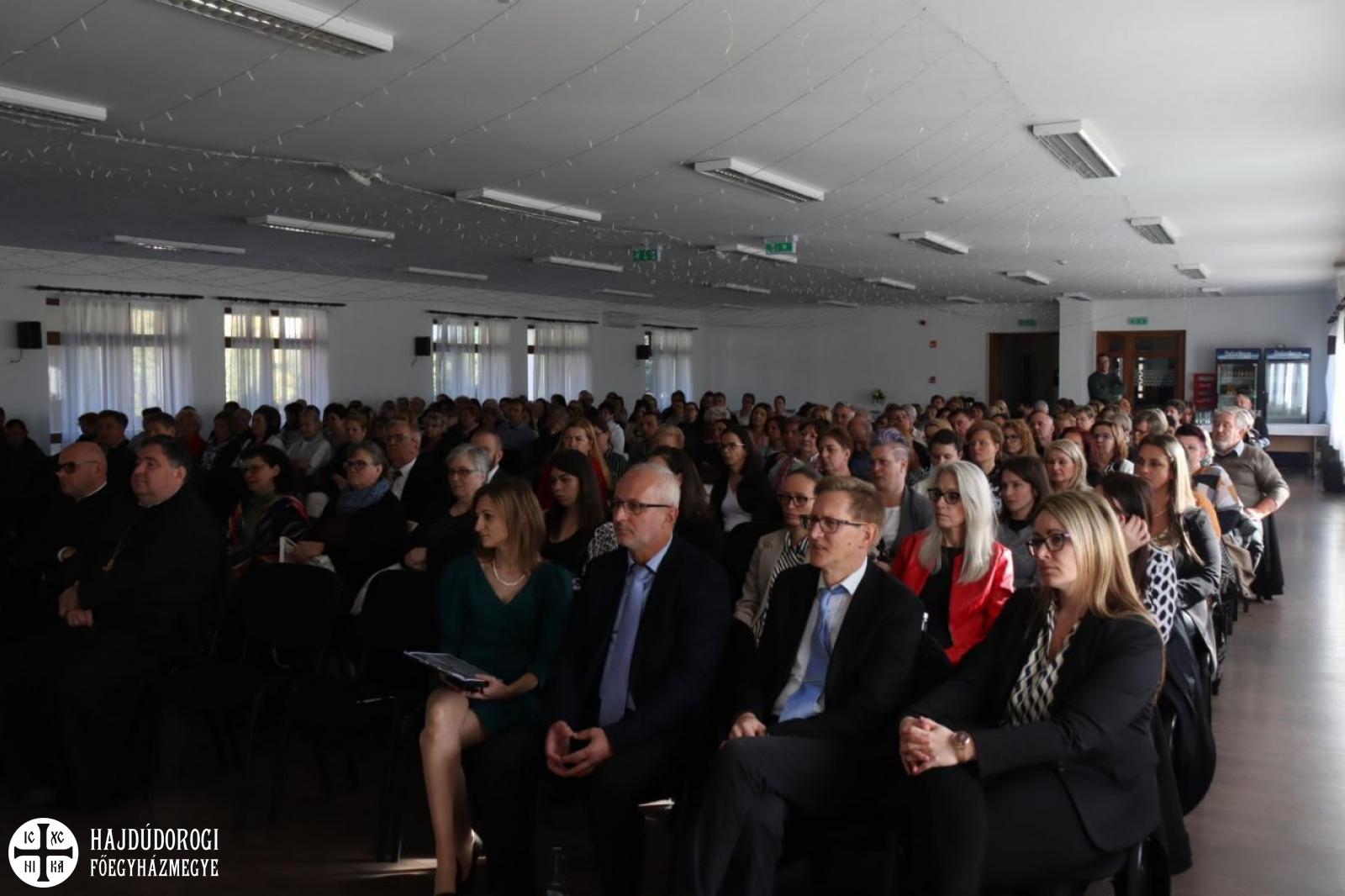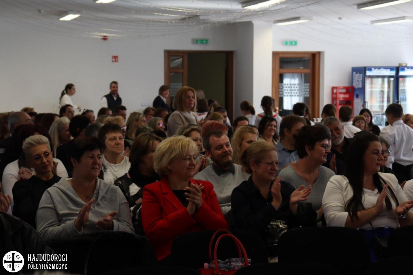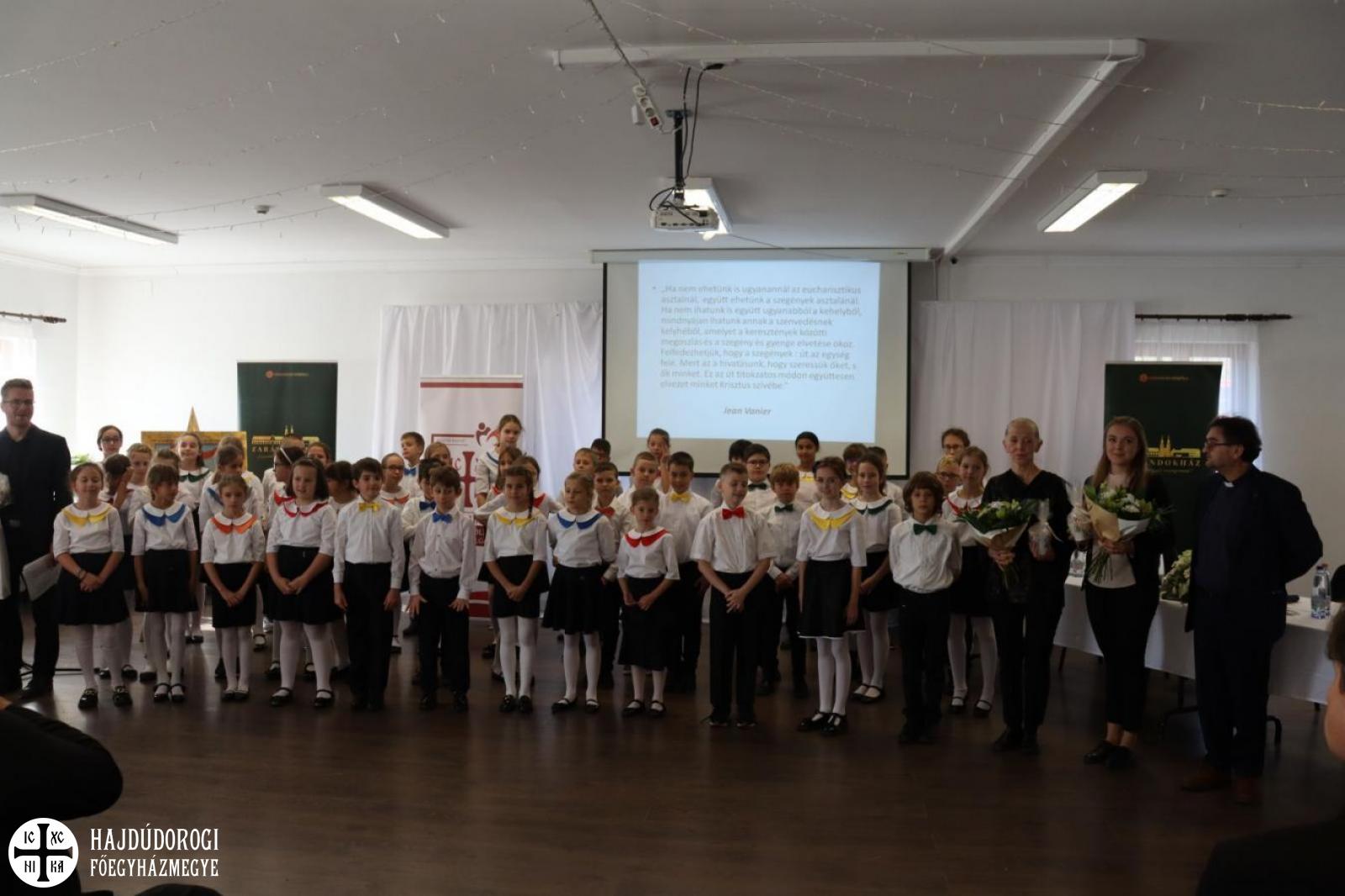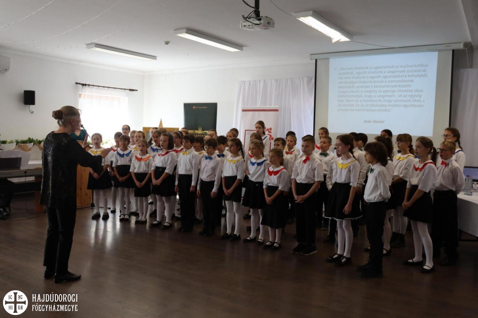 Dr. Horváth Zsolt intézményvezető beszámolója után a lelki nap résztvevőit a zene szárnyán repítette - Deli Gabriella karnagy és Benedek-Paládi Krisztina másodkarnagy vezényletével - a debreceni Szent Efrém Görögkatolikus Általános Iskola és Alapfokú Művészeti Iskola Szivárvány Gyermekkarának előadása, majd ünnepélyes keretek között adták át az idei díjakat.