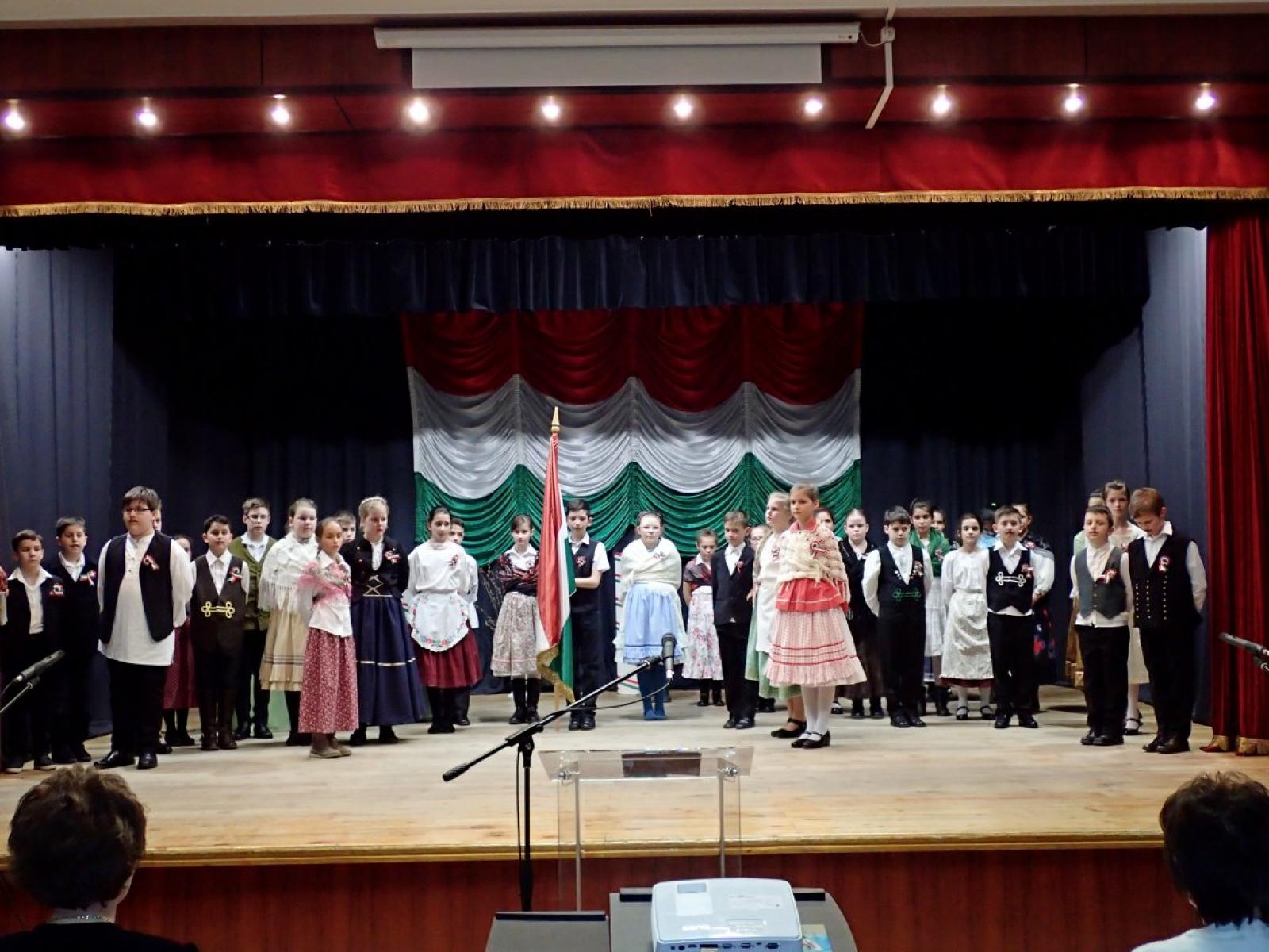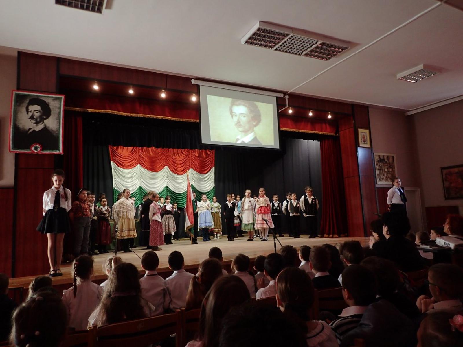 Nemzeti Himnuszunk után a 4. évfolyam színvonalas műsorát nézhettük meg, mely hangulatában megidézte a kor eseményeit és azt a lelkesedést, melyet a forradalmi ifjúság érezhetett. A műsort összeállította és felkészítette a gyerekeket a két osztályfőnök: Magyar Gabriella és Deák Erzsébet, valamint Bordásné Kedves Irén, éneket tanító pedagógus.Diákjaink a városi ünnepségen is bemutatták műsorukat, mellyel méltóképpen képviselték intézményünket.