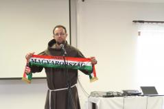 A nyitóelőadást Rockenbauer Barnabás, ferences testvér tartotta. Egyfajta tanúságtételt hallhattak tőle a fiatalok: sajátos előadásban. Mint említette: lételeme a foci, a sport és a ló, lovaglás. Mesélte, hogy beleszületett ebbe a dologba, édesanyja futballszerető asszony volt mindig is. Gyerekkorában ő volt a falu focicsapatának szertárosa. Vasárnaponként korán felkeltek, feltették az ebédet, elmentek a misére, majd ki a futballpályára. Felraktuk a hálót, becsíkoztuk a pályát, kikészítettük a mezeket. Ezután hazamentek ebédelni, majd pedig vissza a meccsre. Amikor véget ért a találkozó, visszapakolták a szereket, és kimosták a mezeket. Ezt látta, ebben nőtt fel, de meghatározó élmény volt az is, hogy kissrácként csapatokba verődve jártak focizni a falu szélére.